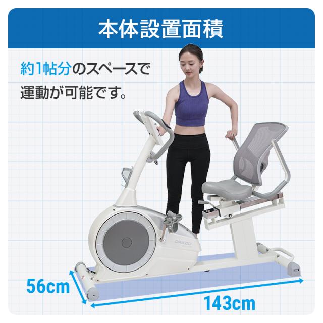 電動負荷調整型リカンベントバイクのエントリーモデル。背もたれ付きのトレーニングバイク。32段階のペダルの重さの調整が可能。。マンションでも安心、静音タイプ。