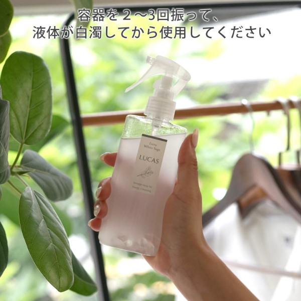 天然ハーブから抽出した冷感素材メントールと、美しい氷のような水晶さざれを贅沢に配合した、冷涼感たっぷりのLUCASの衣類用冷感スプレー。肌着やシャツにシュッとひと吹きするだけで、肌に触れる衣類がひんやりとクールダウン。汗ばむ季節の通勤や外出、お仕事中のリフレッシュにも最適です。ゴルフやテニスなどの屋外スポーツ、キャンプやBBQなどのアウトドアイベントにもおすすめ。■ボトルの中は、はじめは澄んだ透明!軽くシェイクすると、メントールが溶け出して淡く白く変化します。使用するときは容器をよく振って液体を白濁させてから衣類にスプレーしてください。ホワイトセージ精油入りで清涼感のあるミントの香りが広がるので、汗の匂いが気になる方にもおすすめです。■水晶さざれ入りの、癒しのビジュアル!キラリと輝く氷のような天然水晶のさざれ石。見た目にも清涼感を与え、使うたびに気持ちまでリセットされるような感覚に。■薄型のガントリガータイプで持ち運びしやすく使いやすい!スプレーボトルは薄型の容器でバッグに入れやすいサイズです。ガントリガータイプで広範囲にミストを噴射できるので、衣類の冷感効果をムラなく楽しめます。