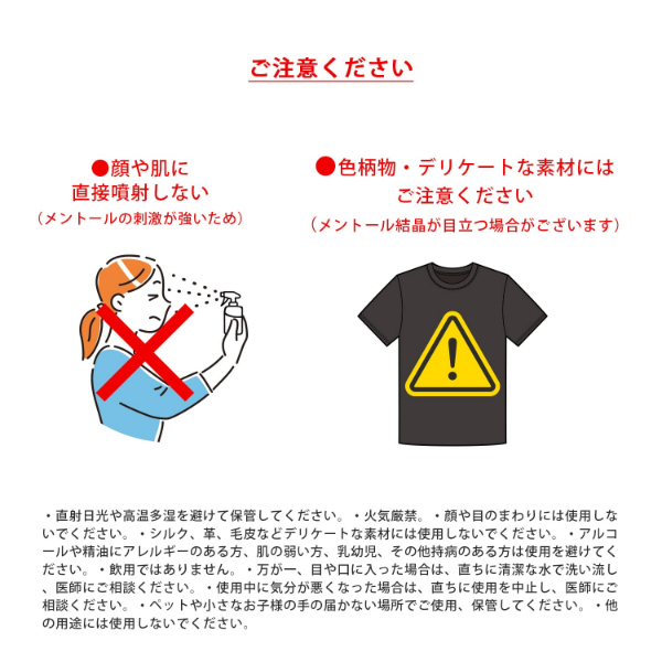 【内容量】130ml【原材料】植物由来エタノール、l-メントール、浄水、精油、天然石(水晶)【ご使用方法】[1]トリガー根元にあるロックを解除します。[2]容器を2-3回振って、液体が白濁してから使用してください。[3]シャツや肌着などに10cmほど離してスプレーしてください。背中など汗をかきやすい箇所に1-2回スプレーすると効果的です。【使用上の注意】●顔や肌に直接スプレーはしない。●高濃度のメントール配合なので少量からお試しください。色物やデリケート素材の衣類に目立たない所で試してからご利用ください。乾燥するとメントール結晶が目立つ可能性がございます。