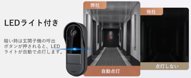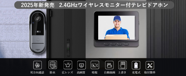ドアカメラに取付枠が装着されており、IP65の防水性能を持ち、屋外での使用や雨天時でも安心して使えるワイヤレスドアホンです。