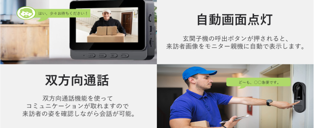 撮影範囲が広く、来訪者はもちろん、複数人の来客でも周囲の状況もしっかりと視認できます。 双方向通話機能を使ってコミュニケーションが取れますので来訪者の姿を確認しながら会話が可能。 留守中の来訪者画像をモニター親機に自動で録画・保存できる録画機能を内蔵しており、帰宅後、写真や映像をモニター画面で確認できます。