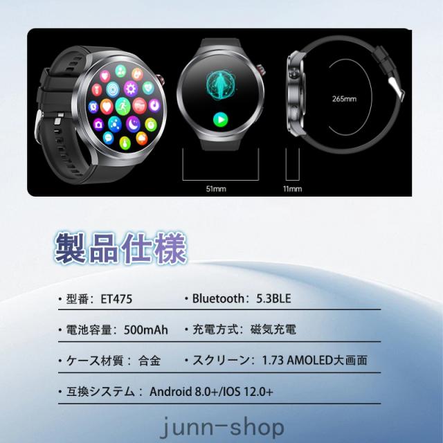 【1.73インチ超大画面&文字盤自由設定】1.73インチの大画面とHD高解像度(466*466)などの要素を組み合わせており、例のない快適な視覚感と優れた操作感をもたらします。更に、文字盤DIY機能もあり、携帯電話中の写真を利用して、お好きな文字盤を作る事もできます。毎日のお気持ちによって、新たな活力を注ぎます。スマートウォッチの言語に英語/韓語など多国の言語を自由に設定できます。付属品:スマートウォッチ 本体×1、充電ケーブル×1、日本語取説書×1。
