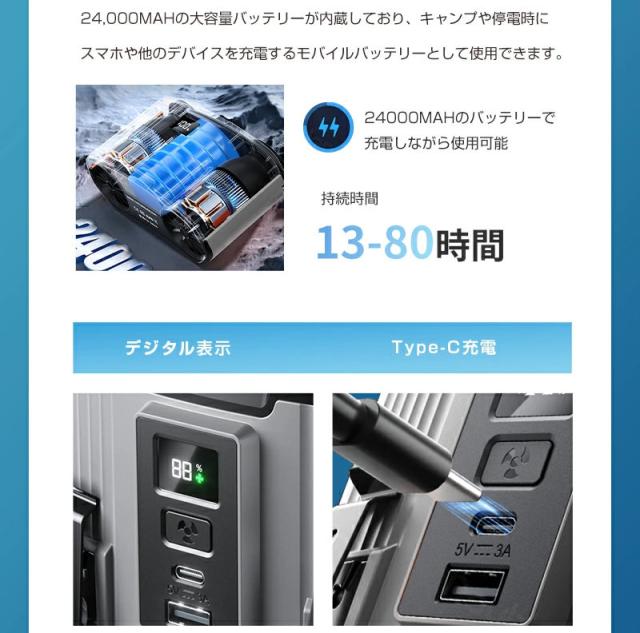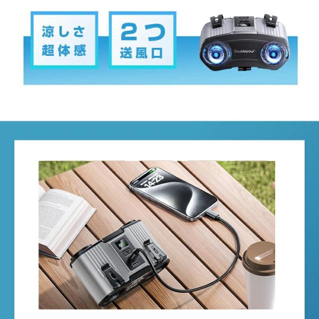 本製品には24,000mAhの大容量バッテリーを内蔵しており、長時間の使用が可能です。最大風量で使用しても、涼しい風を長く楽しめるため、外出先や屋外での作業時にも安心してお使いいただけます。また、USB-A出力ポートがついており、モバイルバッテリーとしても活用でき、スマートフォンやイヤホン、ゲーム機などの充電に対応しています。