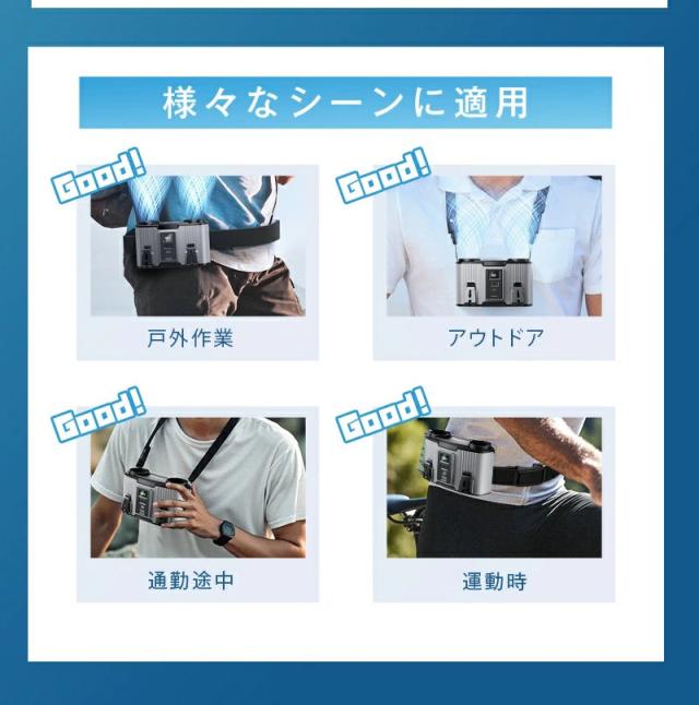 首掛けや腰掛けで使用できる扇風機は、直接風を感じられるため、蒸れを防ぎつつ快適にお使いいただけます。暑い季節でも体が熱くなりにくく、熱中症対策としても効果的です。特に夏の外出時に身につけていただくことで、屋外でも涼しく快適にお過ごしいただけます。