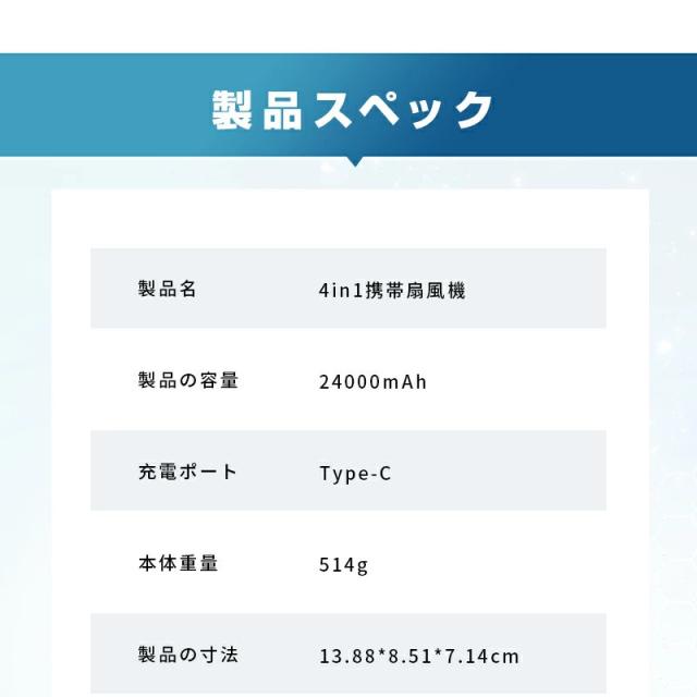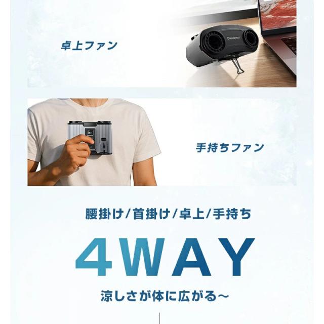 「卓上扇風機」「手持ち扇風機」「腰掛け扇風機」「首掛け扇風機」の4WAY仕様で、シーンに応じて自在に使い分けることができます。さらに、モバイルバッテリー機能を搭載しており、スマートフォンなどの充電も可能です。これ一台で快適な涼しさと電源確保の両方をサポートいたします。暑い季節に欠かせない、便利なアイテムです。