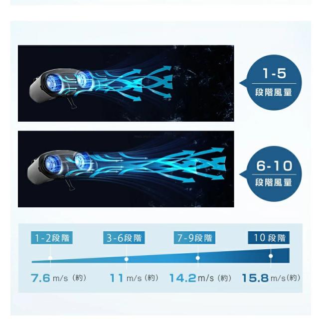 風量は10段階で細かく調整できるため、シーンに応じた最適な風量でお使いいただけます。強い風が必要な日も、やさしいそよ風が心地よい日も、お好みに合わせて快適に調整可能です。ワンボタンで簡単に風量を調節できるため、操作もスムーズです。さらに、静音設計が施されており、周囲を気にせず快適にご利用いただけます。