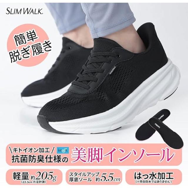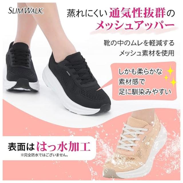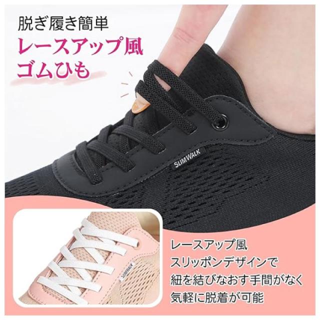 スリムウォーク レディース しゃがまずに履ける ウォーキングシューズ 美脚 スニーカー 厚底 スニーカー シューズ 紐靴 ブラック 黒 ピンク 送料無料 slimwalk SW20045