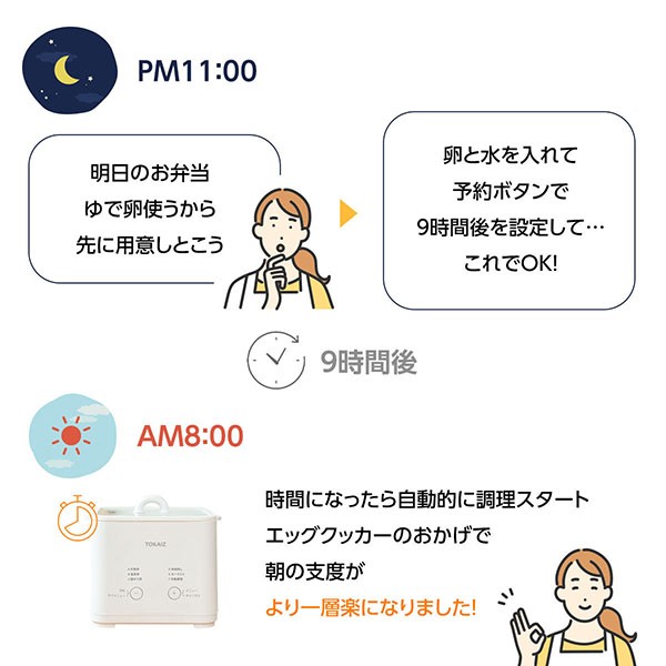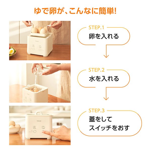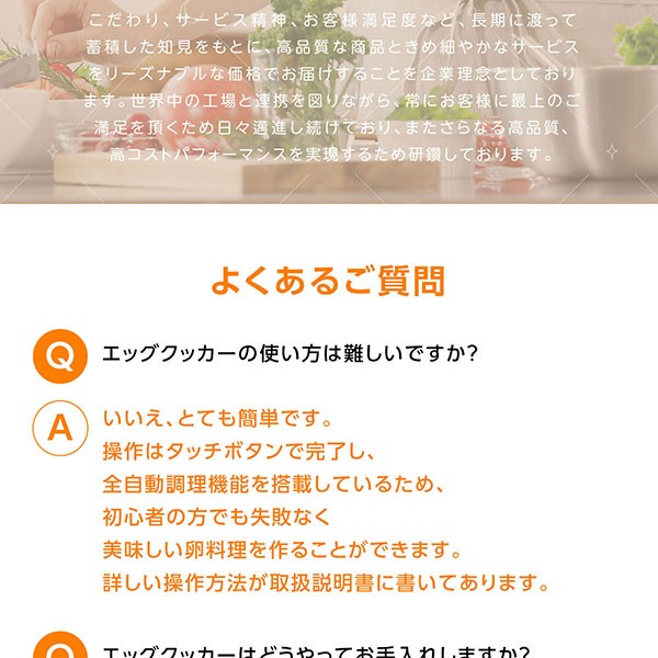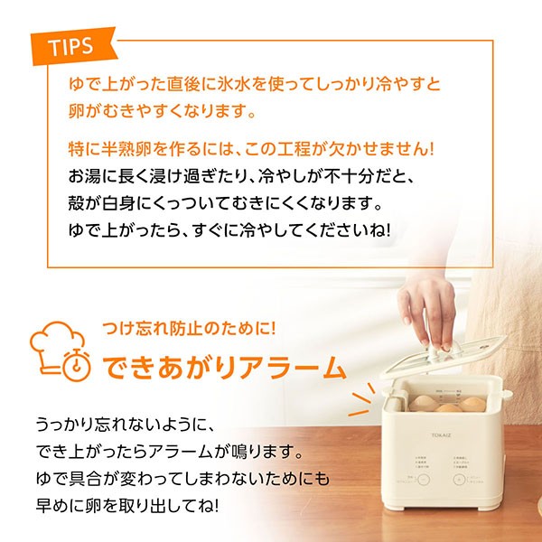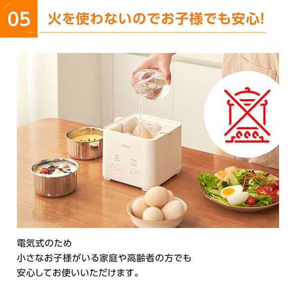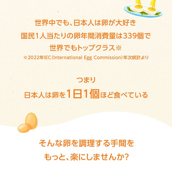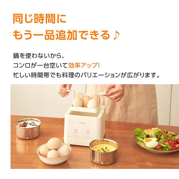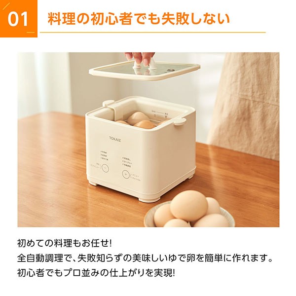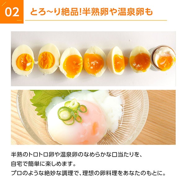 ・【卵料理失敗ゼロ】全自動調理で時間調節不要!初心者でも失敗しません。・【どんな卵も作れる】半熟卵・温泉卵・固ゆで卵、どんな卵も自宅で簡単に作れる。