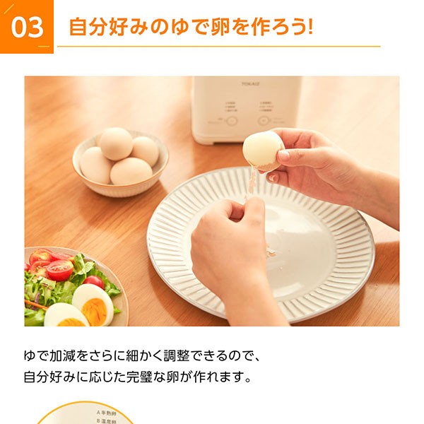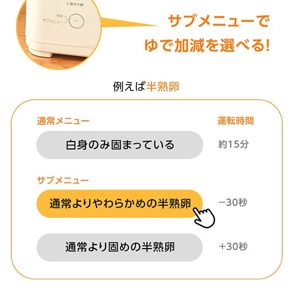 ・【ゆで加減を選べる】サブメニューでさらに細かく食感を調整できます。自分好みの完璧な卵が作れます。