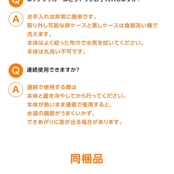 エッグクッカー本体 卵ケース 蒸しケース 電源コード 日本語取扱説明書 オリジナルレシピブック |