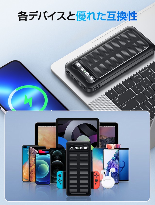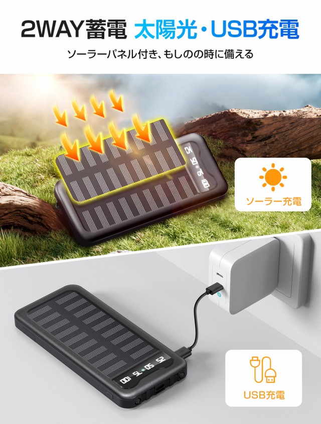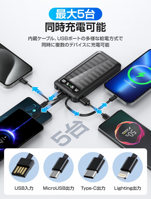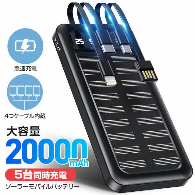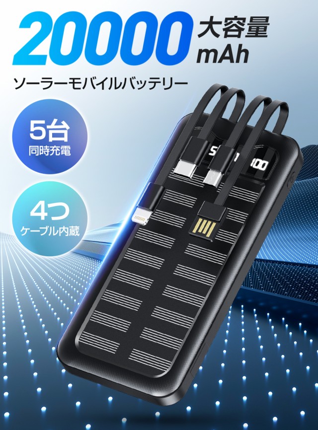 ソーラーモバイルバッテリー 20000mAh 大容量 5台同時充電 ライト付き ソーラー充電器 ケーブル内蔵 防災用品 残量表示 おすすめ
