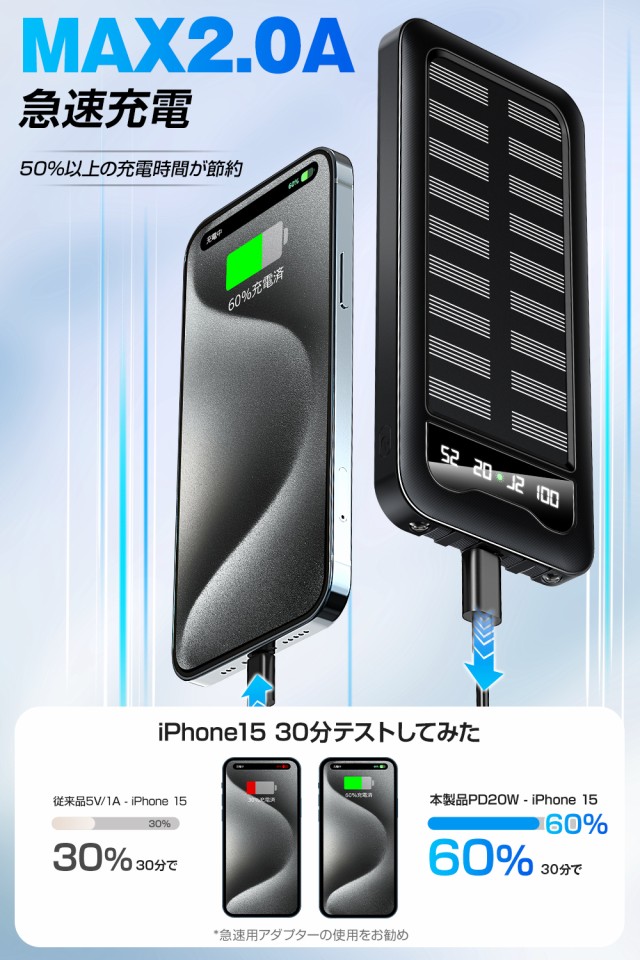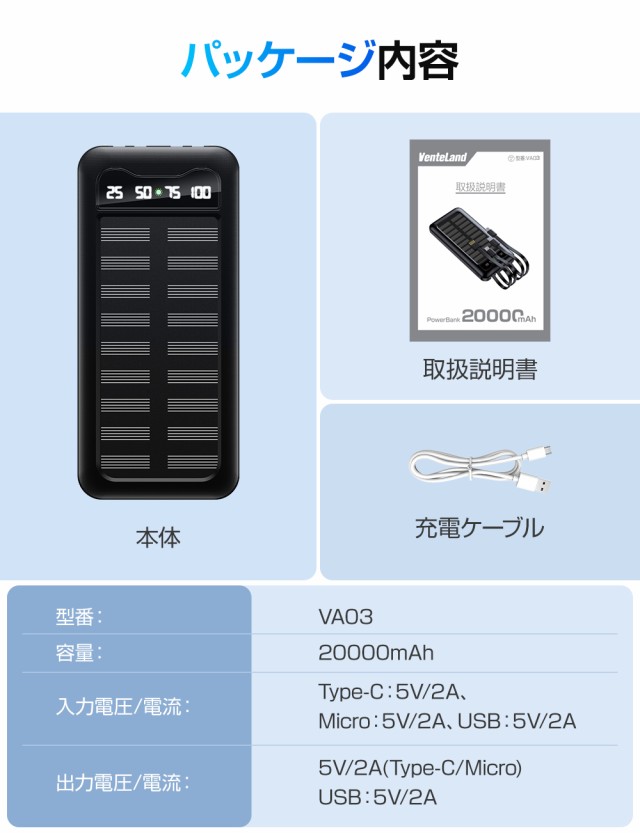20000mAh超大容量を備え、スマホとタブレットはもちろん、カメラ、ゲーム機にも充電できるモバイルバッテリーです。ほとんどのUSB機器に複数回充電可能、旅行、出張など電源の取りにくい環境でバッテリー切れの心配がありません。最大2Aの出力電流でフルスピード充電が可能、通常より充電スピードを大きく上げて、充電時間を短くできます。日頃の使用だけではなく、台風・地震など災害時の非常用電源としても大活躍しています。