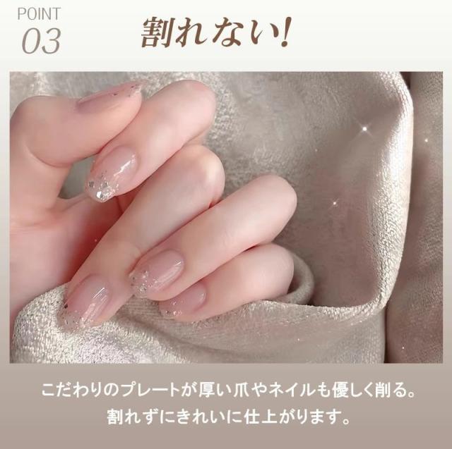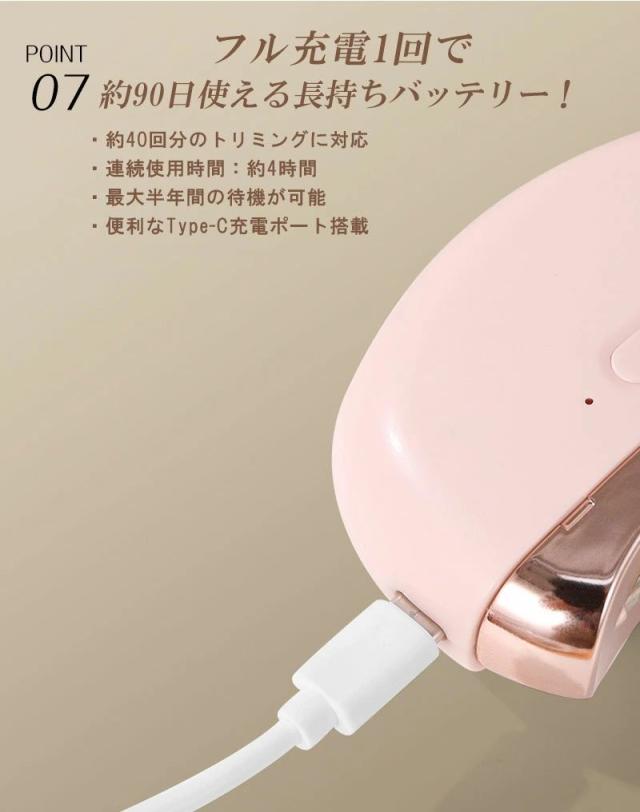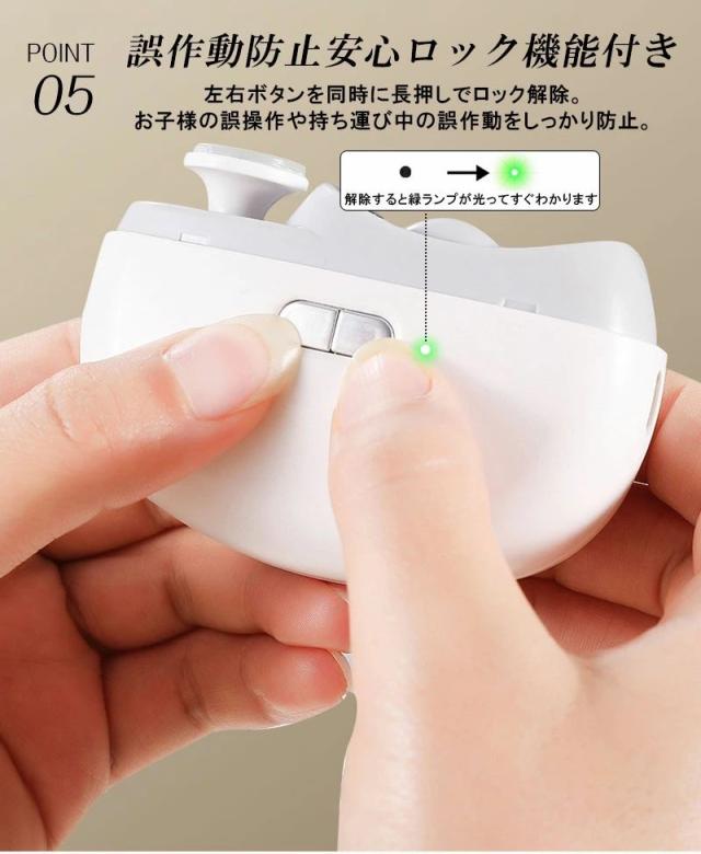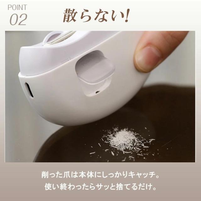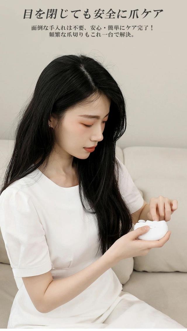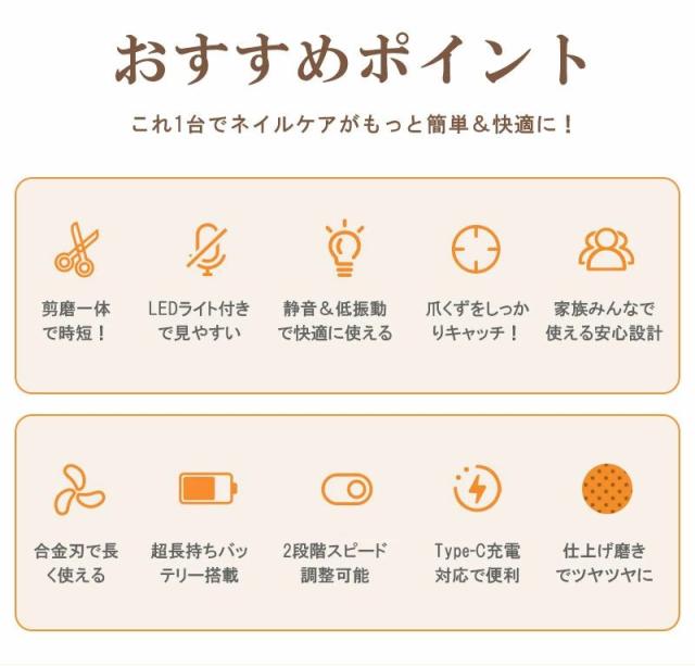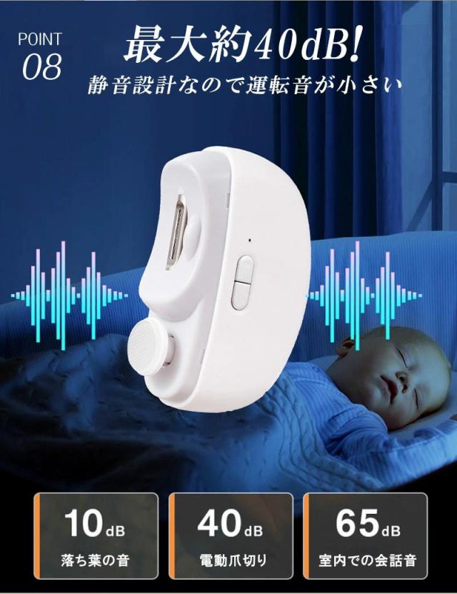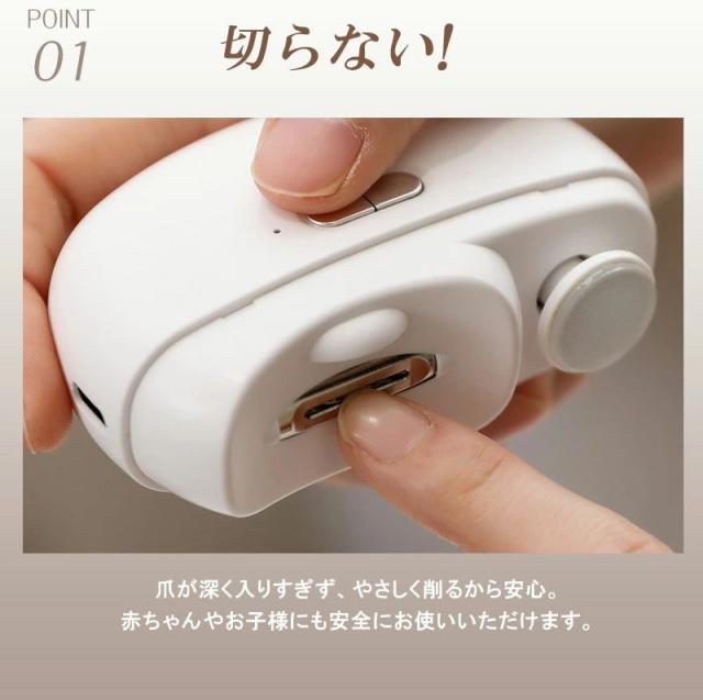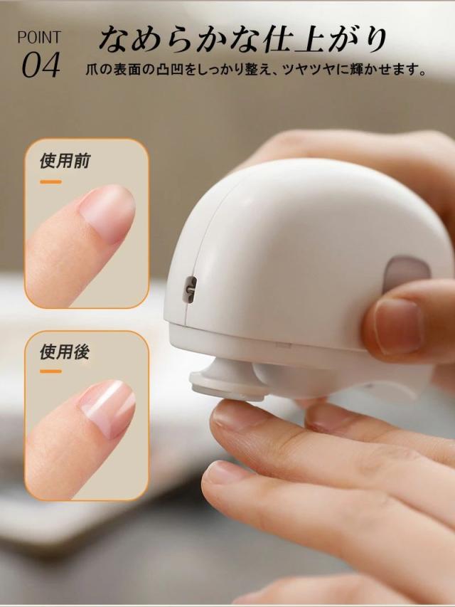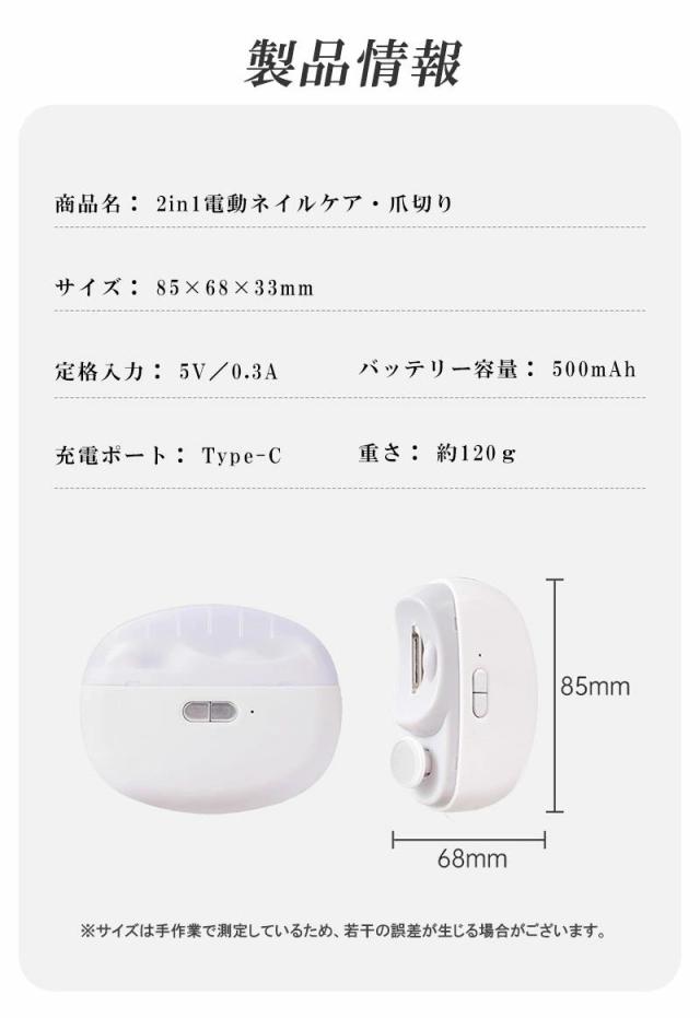 商品名 2in1 電動ネイルケア・爪切り サイズ 85×68×33mm(コンパクトで持ちやすい) 重量 約120g 定格入力 5V / 0.3A バッテリー容量 500mAh(約90日間使用可能な長持ちバッテリー) 充電ポート Type-C対応(急速充電・使いやすい) おすすめポイント 【安全設計で安心ケア】爪が深く入りすぎず、やさしく削るから赤ちゃんやお子様も怖がらずに使えます。また、安全ロック機能付きで誤作動を防止し、高齢者の方も安心してご利用いただけます。【静音&低振動設計】最大40dBの静音設計だから、夜でも気兼ねなく使えます。運転音は落ち葉が舞う音(10dB)に近く、室内会話音(65dB)よりずっと静かです。【LEDライト搭載】先端に明るいLEDライトを搭載。暗い場所でも爪の状態がよく見え、安心してケアが可能です。【爪くずしっかりキャッチ】削った爪は本体内部に溜まるので、掃除が簡単。爪くずが飛び散る心配もありません。【2段階スピード調整】低速モードは柔らかい爪やお子様用に、高速モードは硬い爪やネイルをしたままの爪にも対応。【充電と連続使用】USB Type-C充電対応で約4時間の連続使用が可能。フル充電1回で約90日間使える長持ちバッテリー搭載。 対象 赤ちゃん・子供・大人・高齢者・介護用にも最適。ご家族みんなで使える安心設計の電動爪切りです。 商品名とキャッチコピー2in1 電動爪切 高齢者 足の爪 爪切り 赤ちゃん 電動 爪切り&爪磨き 角質ケア Type-C充電式 簡単操作 静音 電動つめ削り 介護用 高齢者 子供用 簡単操作 LEDライト付き 安全 軽量 コンパクト プレゼント ギフト2in1 電動爪切り LEDライト付き 軽量 静音設計で快適ケア。家族みんなのネイルケアをもっと簡単に!商品名 2in1 電動ネイルケア・爪切り サイズ 85×68×33mm(コンパクトで持ちやすい) 重量 約120g 定格入力 5V / 0.3A バッテリー容量 500mAh(約90日間使用可能な長持ちバッテリー) 充電ポート Type-C対応(急速充電・使いやすい) おすすめポイント 【安全設計で安心ケア】爪が深く入りすぎず、やさしく削るから赤ちゃんやお子様も怖がらずに使えます。また、安全ロック機能付きで誤作動を防止し、高齢者の方も安心してご利用いただけます。【静音&低振動設計】最大40dBの静音設計だから、夜でも気兼ねなく使えます。運転音は落ち葉が舞う音(10dB)に近く、室内会話音(65dB)よりずっと静かです。【LEDライト搭載】先端に明るいLEDライトを搭載。暗い場所でも爪の状態がよく見え、安心してケアが可能です。【爪くずしっかりキャッチ】削った爪は本体内部に溜まるので、掃除が簡単。爪くずが飛び散る心配もありません。【2段階スピード調整】低速モードは柔らかい爪やお子様用に、高速モードは硬い爪やネイルをしたままの爪にも対応。【充電と連続使用】USB Type-C充電対応で約4時間の連続使用が可能。フル充電1回で約90日間使える長持ちバッテリー搭載。 対象 赤ちゃん・子供・大人・高齢者・介護用にも最適。ご家族みんなで使える安心設計の電動爪切りです。