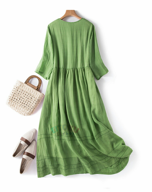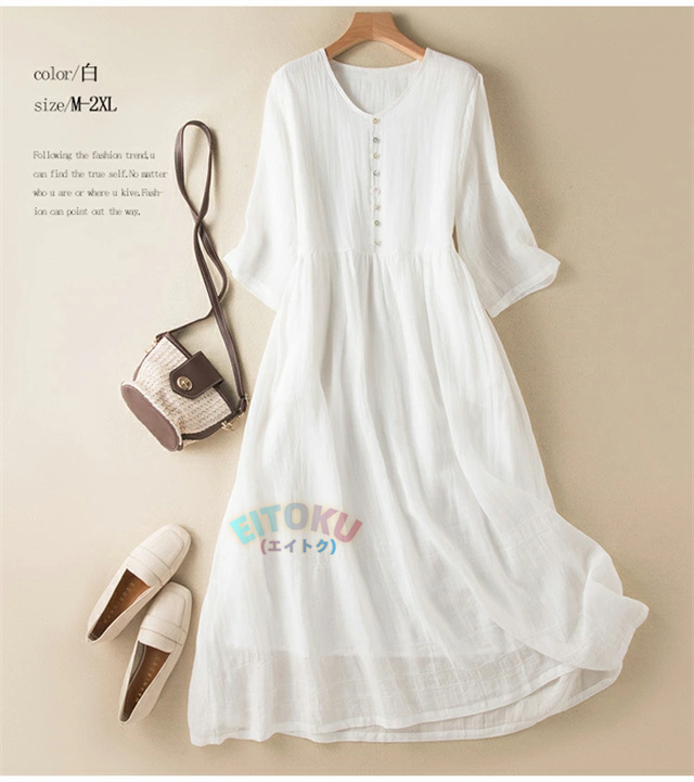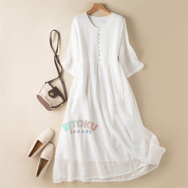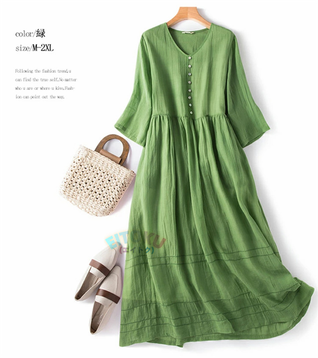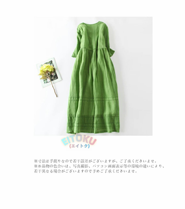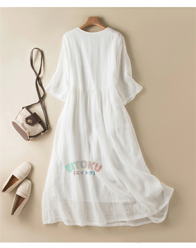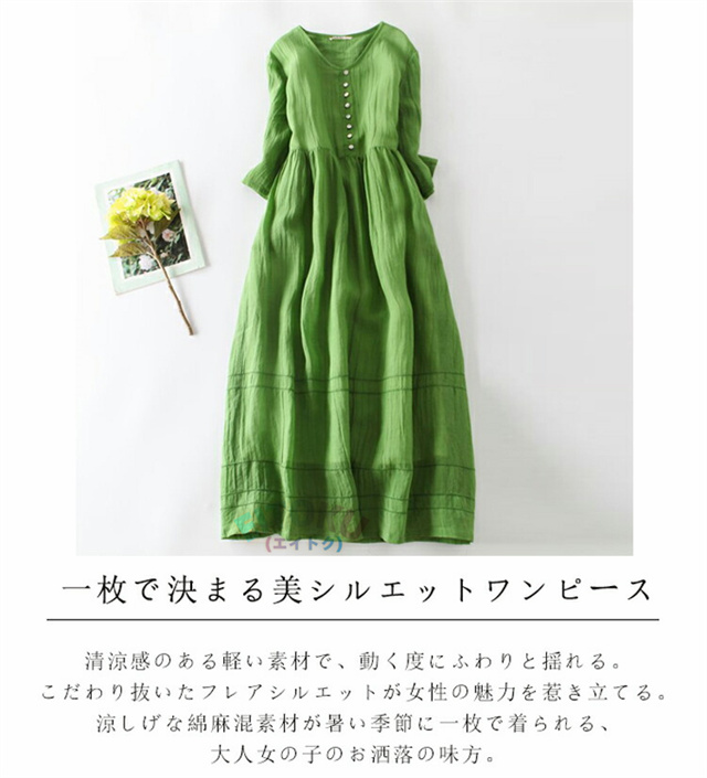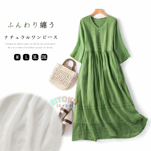 ワンピース 綿麻 ワンピース きれいめ 五分袖 春 ロングワンピース 夏 vネック フレアワンピース ふんわり ボリューム 軽い シャツワンピース ロング きれい 裏地付き aラインワンピース 体型カバー 着痩せ ロングワンピ ワンピ シンプル ミモレ丈ワンピース 森ガール