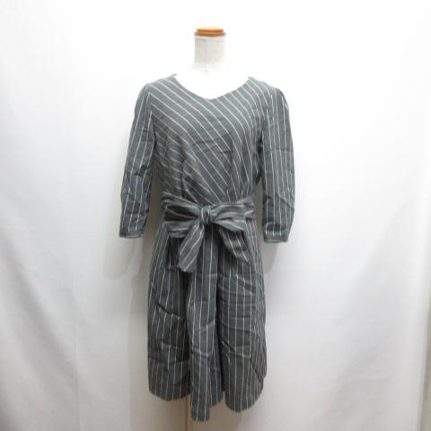 【中古】エマジェイムス EMMAJAMES ストライプ柄 七分袖 ワンピース ウエストリボン 11 グレー 裏地付き レディース