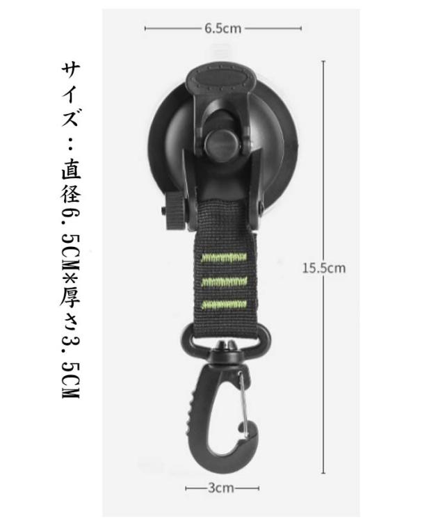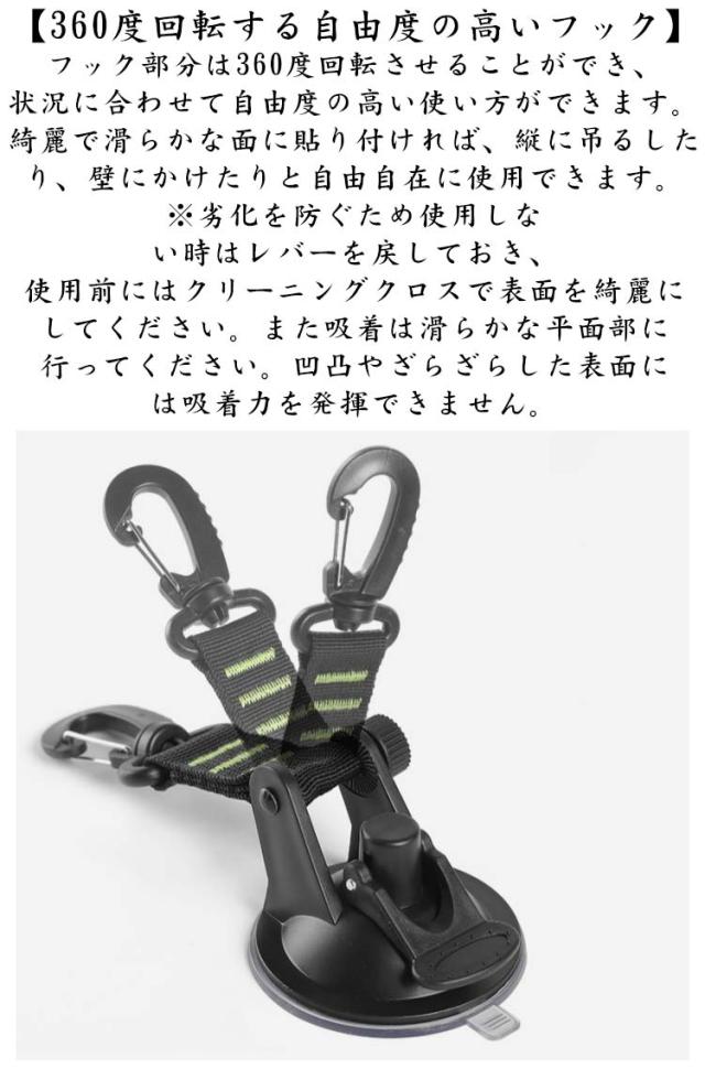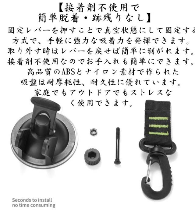 | 【強力真空吸盤フックセット】セット内容:吸盤フック4個。360度回転しロック式の自由度の高いフックです。使用前に付属のタオルでガラスを拭くことができます。車のサイドテントやサンシェードの固定に使う場合は取付穴の種類によってS字フックを選択することができます。吸盤素材:ナイロン紐+ABS・サイズ:直径6.5cm*厚さ3.5cm 【接着剤不使用で簡単脱着・跡残りなし】固定レバーを押すことで真空状態にして固定する方式で、手軽に強力な吸着力を発揮できます。取り外す時はレバーを戻せば簡単に剥がれます。接着剤不使用なのでお手入れも簡単にできます。 高品質のABSとナイロン素材で作られた吸盤は耐摩耗性、耐久性に優れています。家庭でもアウトドアでもストレスなく使用できます。 【360度回転する自由度の高いフック】フック部分は360度回転させることができ、状況に合わせて自由度の高い使い方ができます。綺麗で滑らかな面に貼り付ければ、縦に吊るしたり、壁にかけたりと自由自在に使用できます。※劣化を防ぐため使用しない時はレバーを戻しておき、使用前にはクリーニングクロスで表面を綺麗にしてください。また吸着は滑らかな平面部に行ってください。凹凸やざらざらした表面には吸着力を発揮できません。 【多用途】吸着フックは殆どの物を固定することができる優れた方法です。いつ落ちるかの不安に悩まされることはもうありません。カーサイドタープやサンシェードの固定として使用できるだけでなく、屋内外での使用やカーキャンプや旅行などでの仮設アイテムフックとして使用できます。アウトドアに最適ですが、家でもバスルームやキッチンのフックとしても使用することができます。 | |