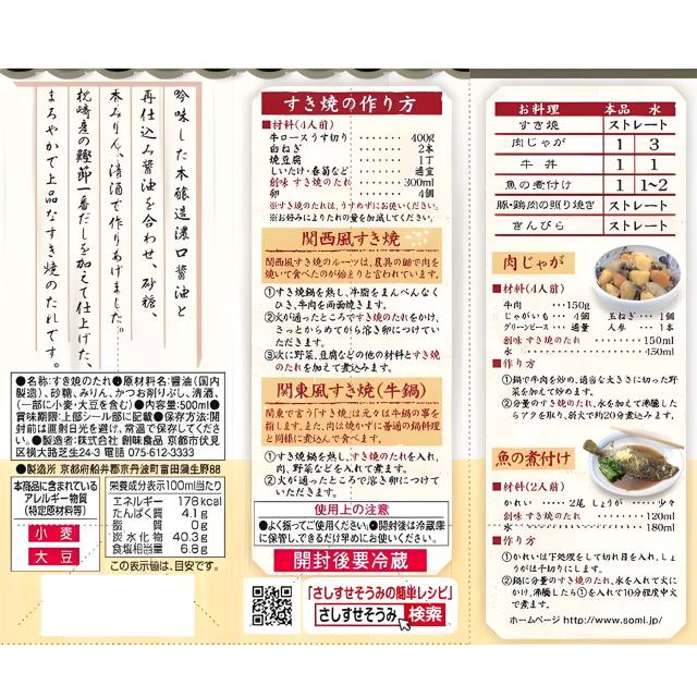 創味 すき焼きのたれ 500ml 1本 2本 6本 そうみ すきやきのたれ 牛鍋 花鰹仕立て ストレート 鰹節 一番だし 調味料 鶏肉 照り焼き 牛丼 アイスクリーム 本醸造濃口醤油 魚の煮付け 魚 丼物 煮付け 和風 料理 炊き込みご飯 カレイの煮付け 牛すき 煮つけ 豚肉 酢豚 蒲焼