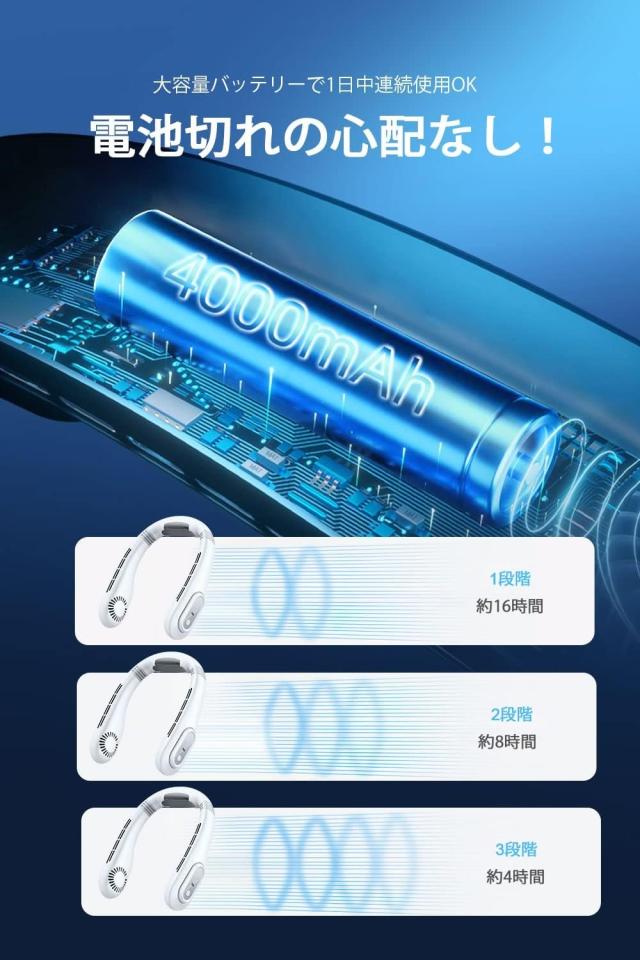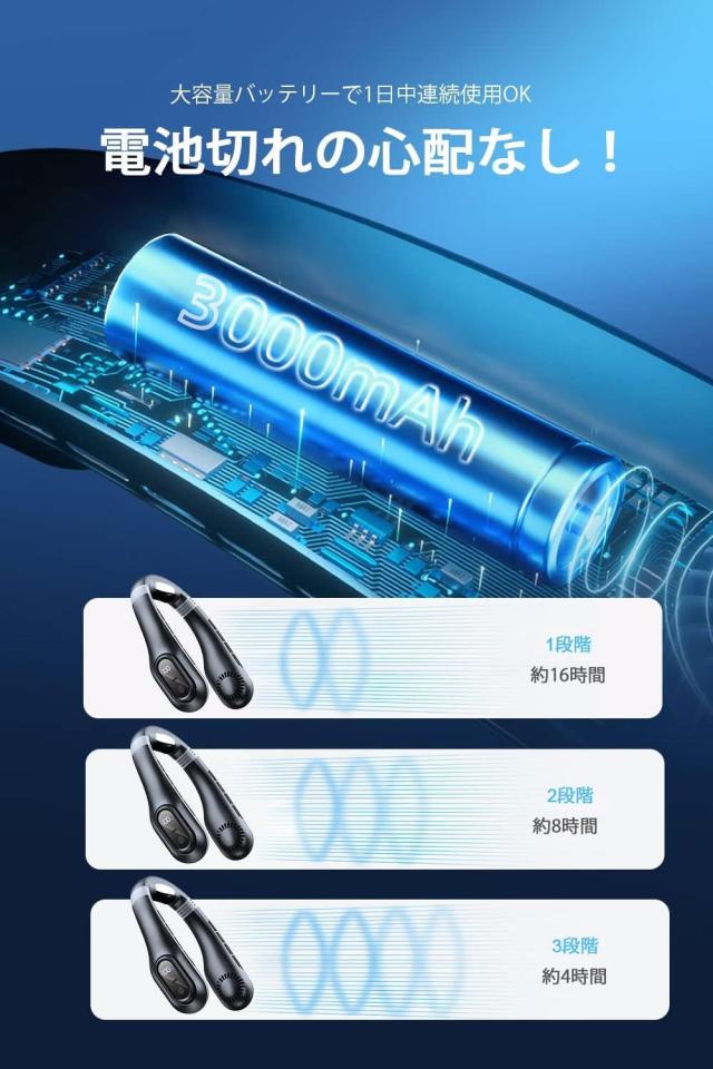 【大容量3000mAhバッテリー搭載、最大16時間連続使用可能】 長時間の外出時や旅行先でも安心の朝から晩まで涼しさが持続。今夏必携のくびかけ扇風機です。