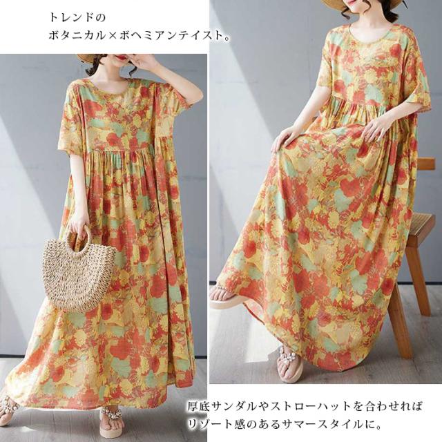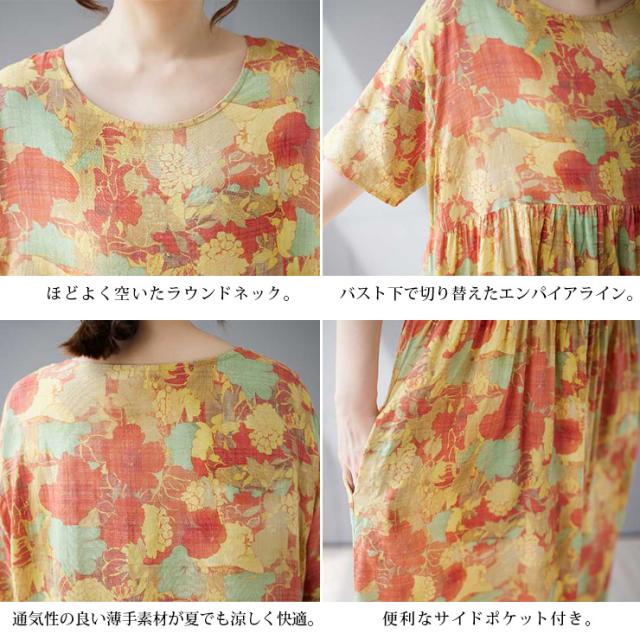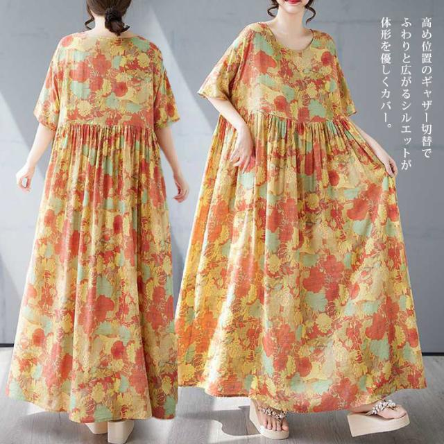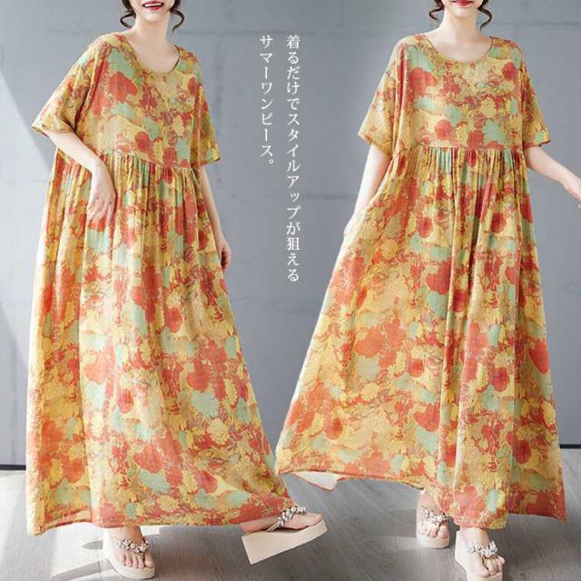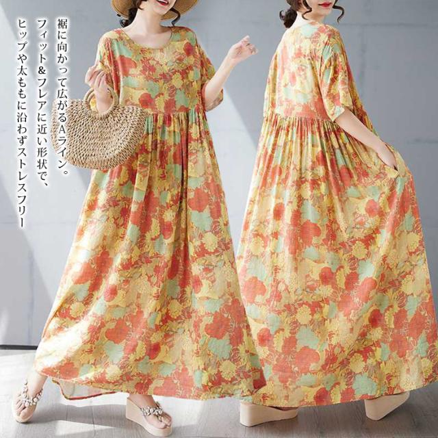 ワンピース 花柄 ロング丈 マキシ丈 ゆったり 体型カバー 半袖 夏用 レディース (72078)