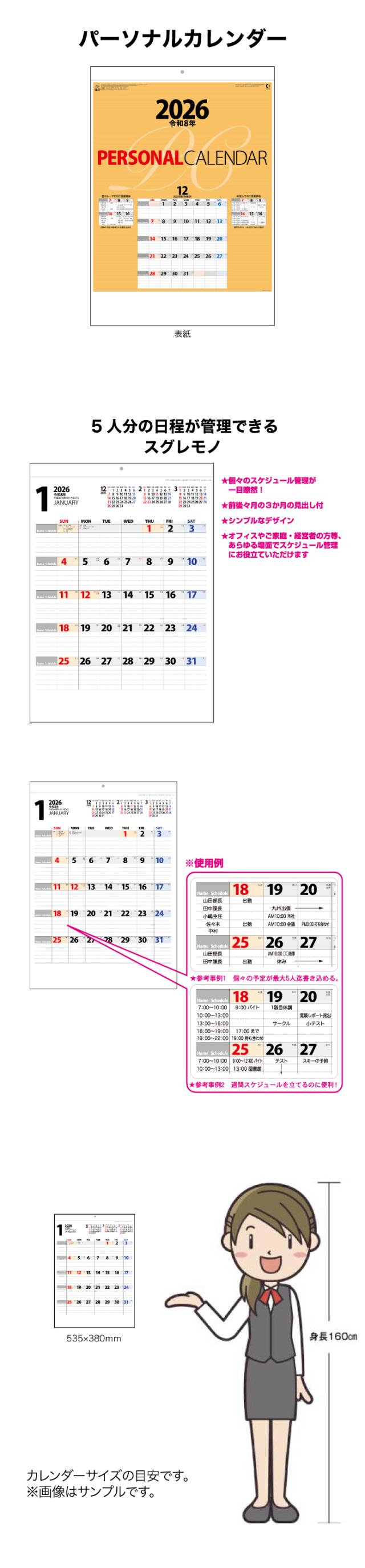 | 2026年 壁掛け パーソナルカレンダー NK445 商品詳細 | |