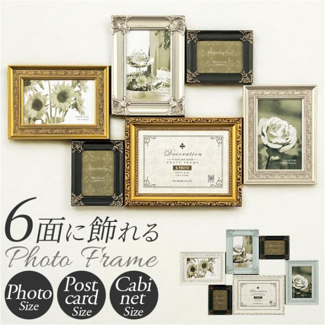 フォトフレーム 壁掛け おしゃれ 通販 デコレーション 6 ウォール&スタンド フォトスタンド 写真立て フォト フレーム 写真 スタンド 6枚 6面 アンティーク調 卓上 立て掛け L判ハーフ ポストカード キャビネ 壁飾り 記念写真 アート インテリア