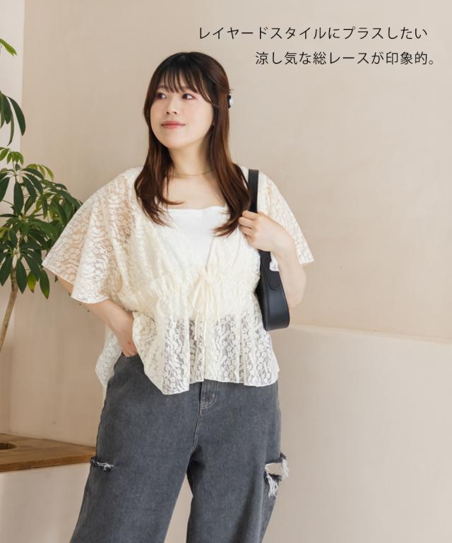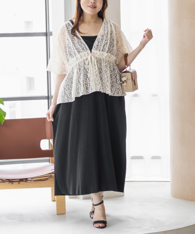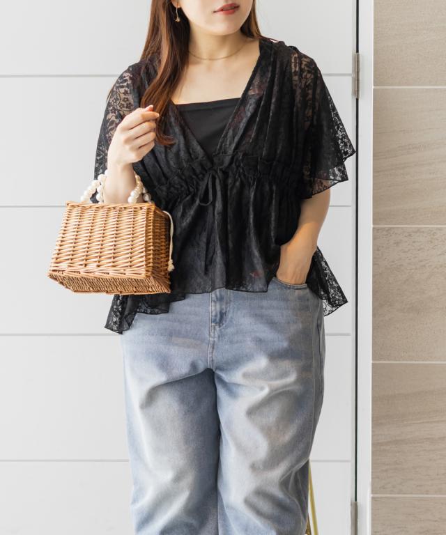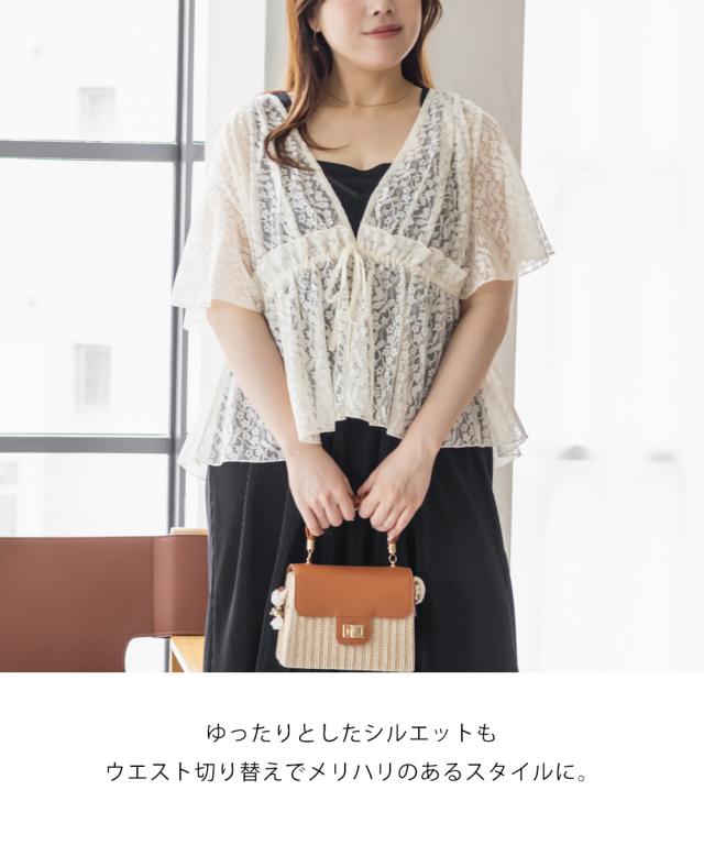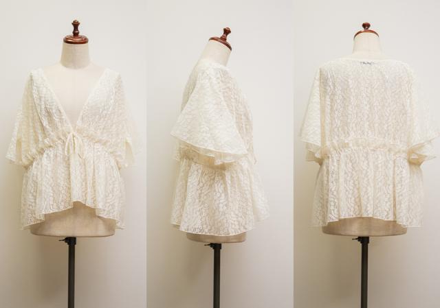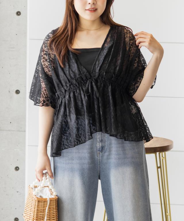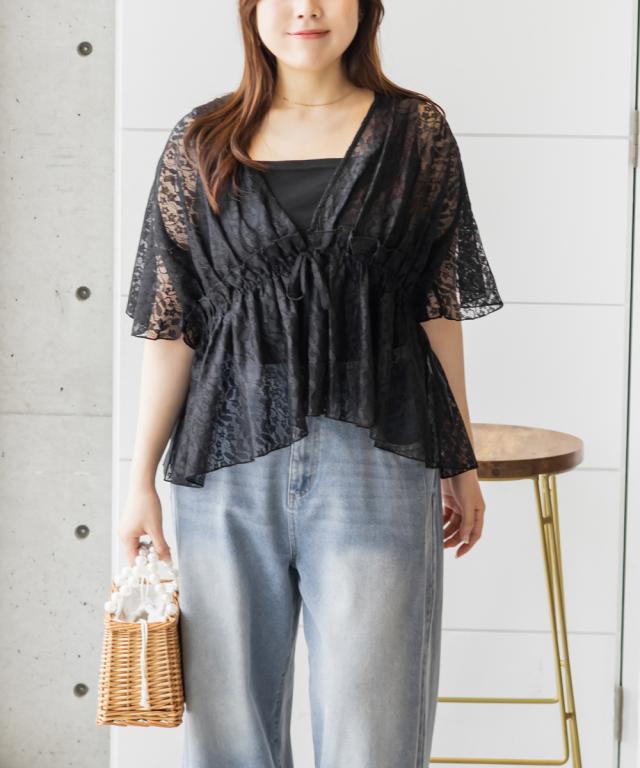| 3Lサイズ着用しました。程よくゆとりを持って着られるシルエットでした! ウエストはゴムになっていてそこから広がるペプラム切替でメリハリもありつつ、気になる所はしっかりカバーしてくれます! ネックはすっきりと開いた深いVネックになっていて、タンクトップやキャミソール・キャミワンピなどと重ねて着るだけでお洒落な雰囲気が楽しめます♪水着の上に着ても良さそうと思いました◎ 透け感が上品な花柄で、肉感を拾いにくい少しハリのある軽いレース生地だったので、快適に涼しく着られる夏にぴったりな1枚です! |