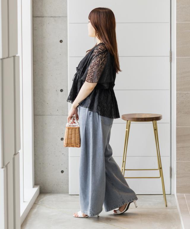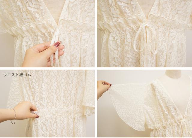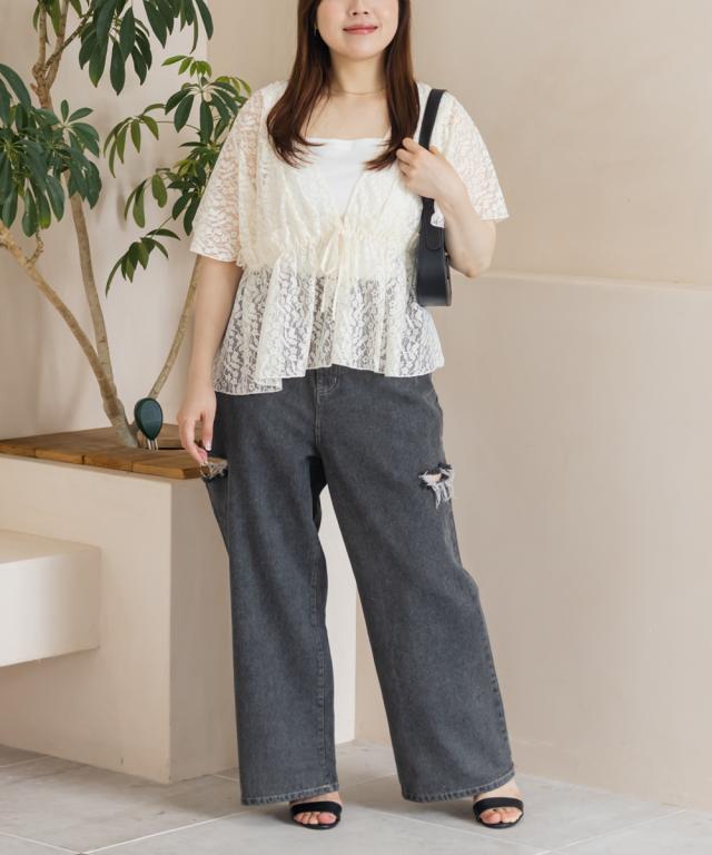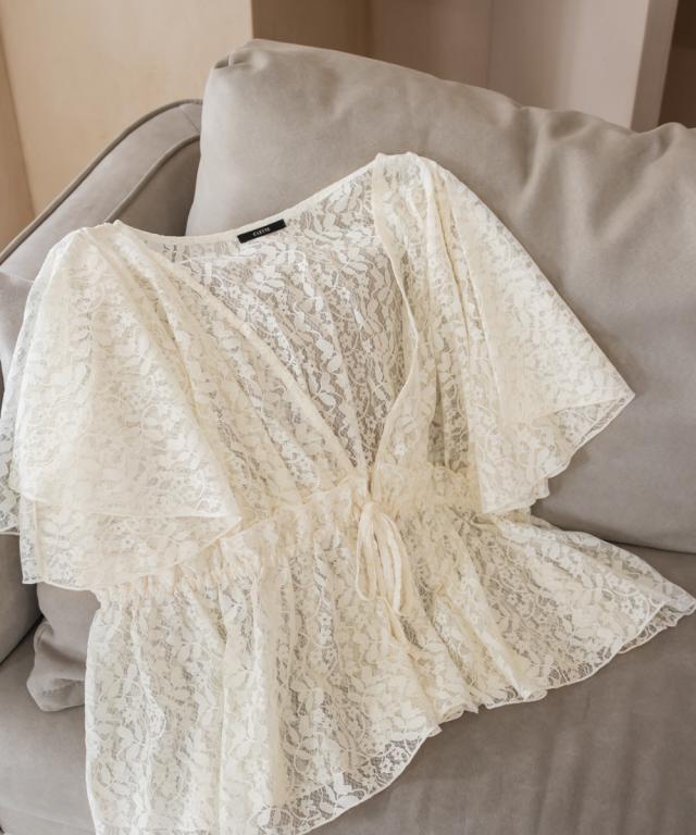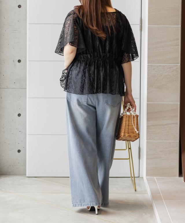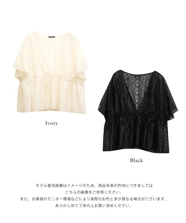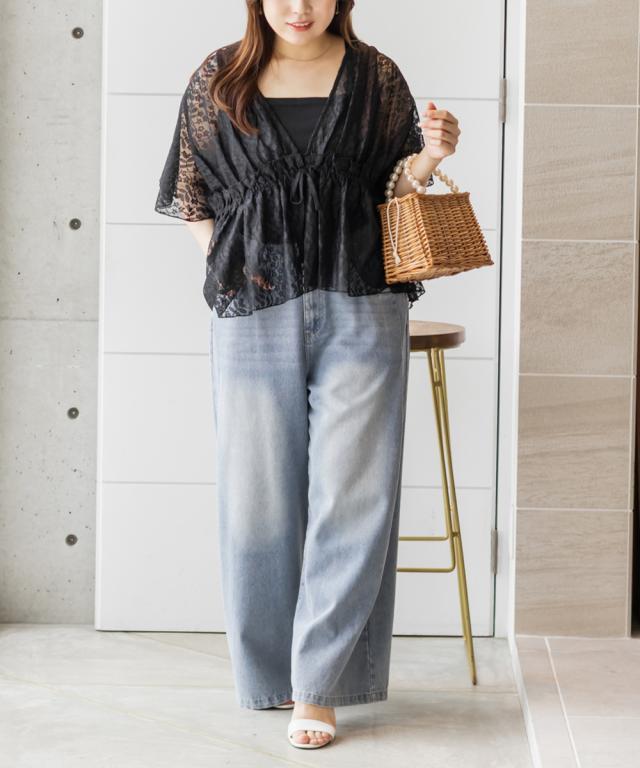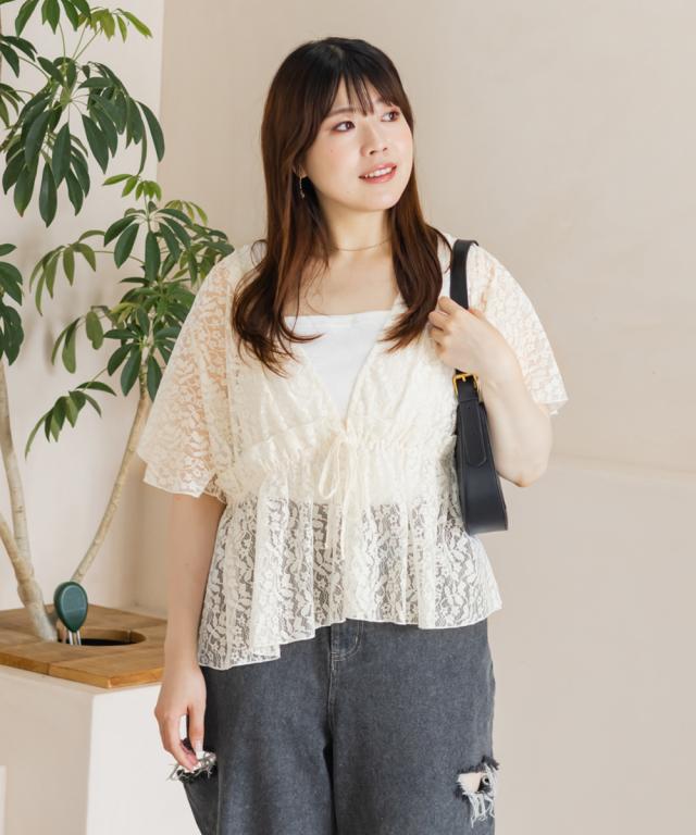 | 3Lサイズ着用しました。程よくゆとりを持って着られるシルエットでした! ウエストはゴムになっていてそこから広がるペプラム切替でメリハリもありつつ、気になる所はしっかりカバーしてくれます! ネックはすっきりと開いた深いVネックになっていて、タンクトップやキャミソール・キャミワンピなどと重ねて着るだけでお洒落な雰囲気が楽しめます♪水着の上に着ても良さそうと思いました◎ 透け感が上品な花柄で、肉感を拾いにくい少しハリのある軽いレース生地だったので、快適に涼しく着られる夏にぴったりな1枚です! |