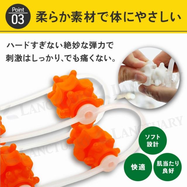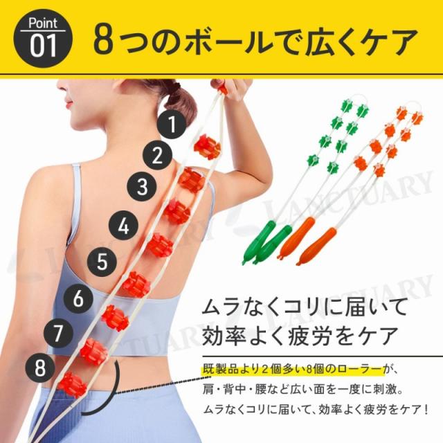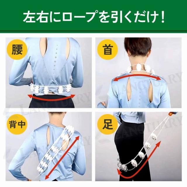 しなやかなロープと突起付きの8つのローラーが体のカーブにぴったりフィット。背中や腰、肩、脚などの気になる部位にゴロゴロ転がすだけで、まるでプロの手でほぐされているような気持ちよさを実感できます。