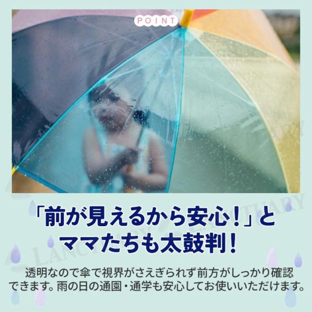 雨の日の小さなお子様の安全と、心弾むような楽しさを考えて作られたキッズ傘です。傘の生地は透明なPVC素材。これにより、雨の中でも視界はクリアで、前方がしっかりと見えて安心です。