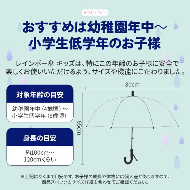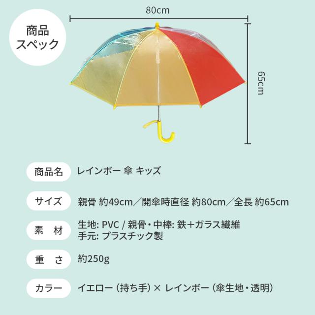 | 主な仕様 | 商品名: レインボー傘 キッズ サイズ: 親骨 約49cm/開傘時直径 約80cm/全長 約65cm 素材: 生地: PVC 親骨・中棒: 鉄+ガラス繊維 手元: プラスチック製 重さ: 約250g カラー: イエロー(持ち手)× レインボー(傘生地・透明) |