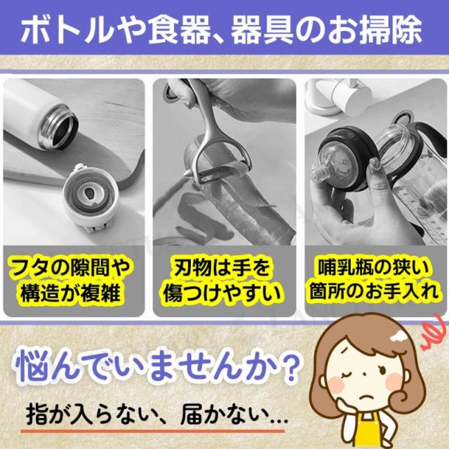ボトルや食器、器具のお掃除に悩んでいませんか?フタの隙間や構造が複雑、刃物は手を傷つけやすい、哺乳瓶の狭い箇所のお手入れの指が入らない、届かない…などのお悩みに!様々なシーンで大活躍!