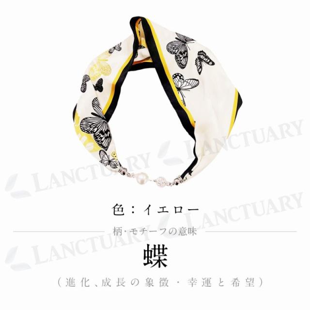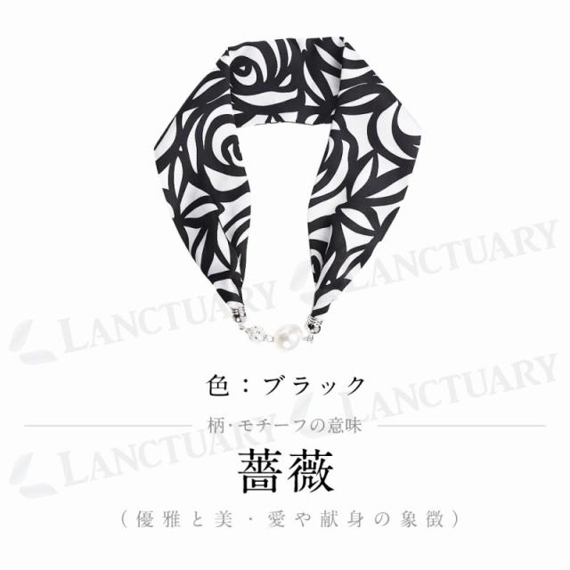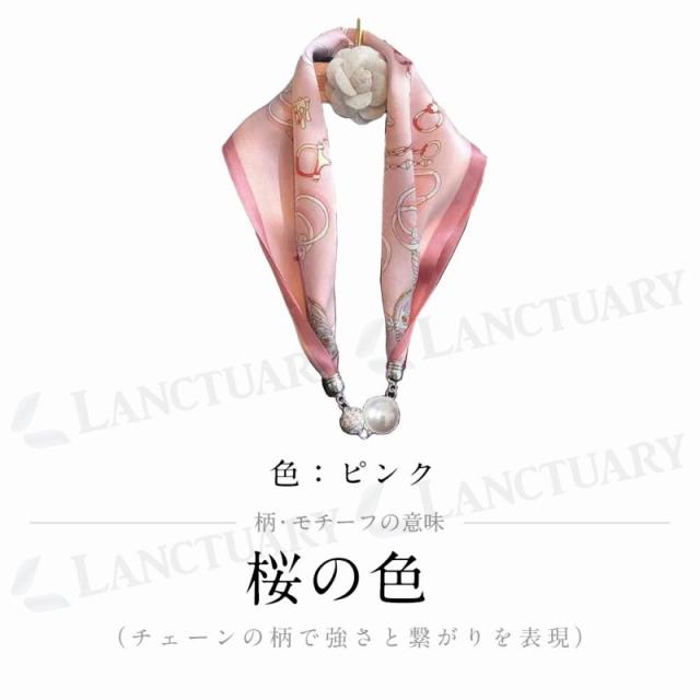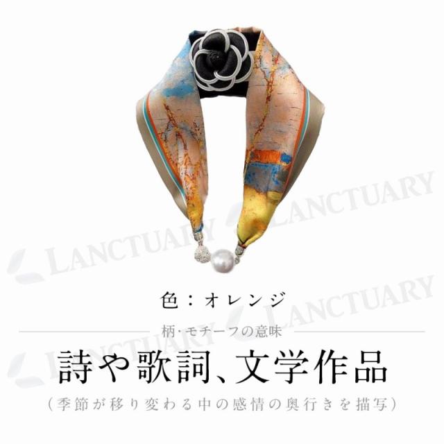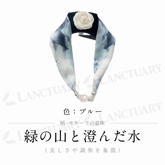 | 主な仕様 | 【カラー】 ブラック ブルー イエロー オレンジ ピンク 【柄の由来モチーフの意味】 柄の由来モチーフの意味 【ブラック】薔薇(優雅と美・愛や献身の象徴) 【ブルー】緑の山と澄んだ水(美しさや調和を象徴) 【イエロー】蝶(進化、成長の象徴・幸運と希望) 【オレンジ】詩や歌詞、文学作品(季節が移り変わる中の感情の奥行きを描写) 【ピンク】桜の色(チェーンの柄で強さと繋がりを表現) すべて、真珠を用いた高級感のあるデザインや装飾が特徴的 【サイズ】 全長56cm スカーフ幅1cm パール幅 2cm 【重さ】 24g |