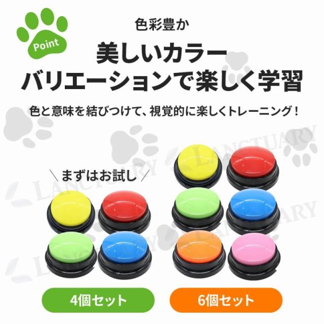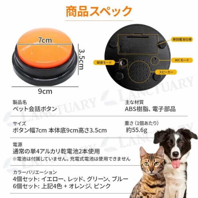 | 主な仕様 | 商品名: ペット会話ボタン 主な材質: ABS樹脂、電子部品 サイズ: ボタン上面直径:約7cm、ボタン全体の直径/幅:約9cm、高さ:約3.5cm 重さ(1個あたり): 約55.6g 電源: 通常の単4アルカリ乾電池2本使用※電池は付属していません。 カラー: 4個セット(イエロー、レッド、グリーン、ブルー)、6個セット(4個セットの色に加えてオレンジ、ピンク) |