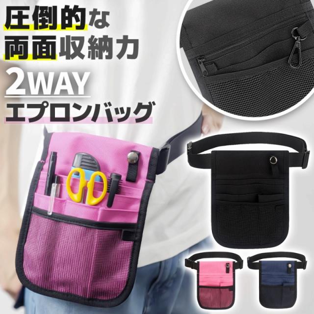 エプロンバッグ 2way 収納力 多機能 ポケット 軽量 薄型 コンパクト 長さ調整可 ボタンループ フック テープ 鍵 メッシュ ブラック ネイビー ピンク 園芸 医療