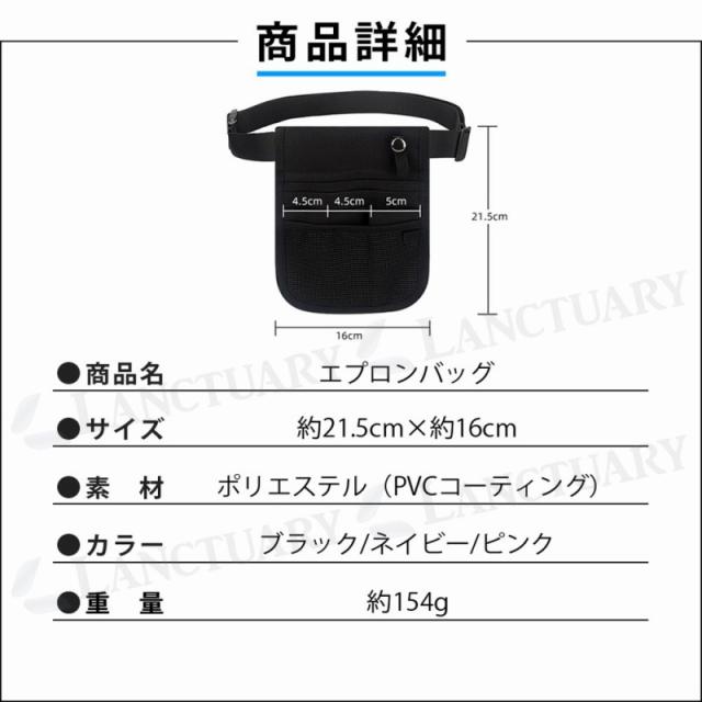 | 主な仕様 | 商品名:エプロンバッグ サイズ:縦:21.5cm 横:16cm カラー:ブラック ネイビー ピンク 素材:ポリエステル(PVCコーティング) 重さ: 154g |