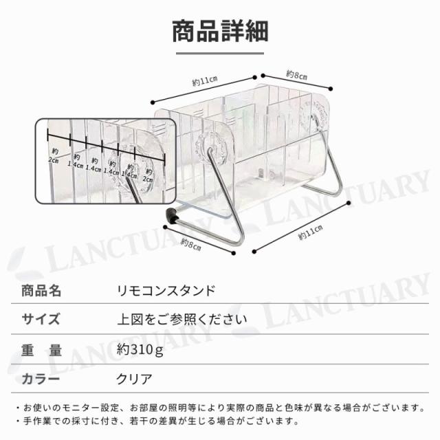 | 主な仕様 | 商品名:リモコンスタンド サイズ:約11×16×12cm 重量:約310g カラー:クリア ・お使いのモニター設定、お部屋の照明等により実際の商品と色味が異なる場合がございます。 ・手作業での採寸に付き、若干の差異が生じる場合がございます。 |
