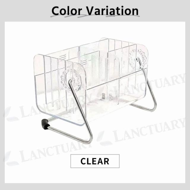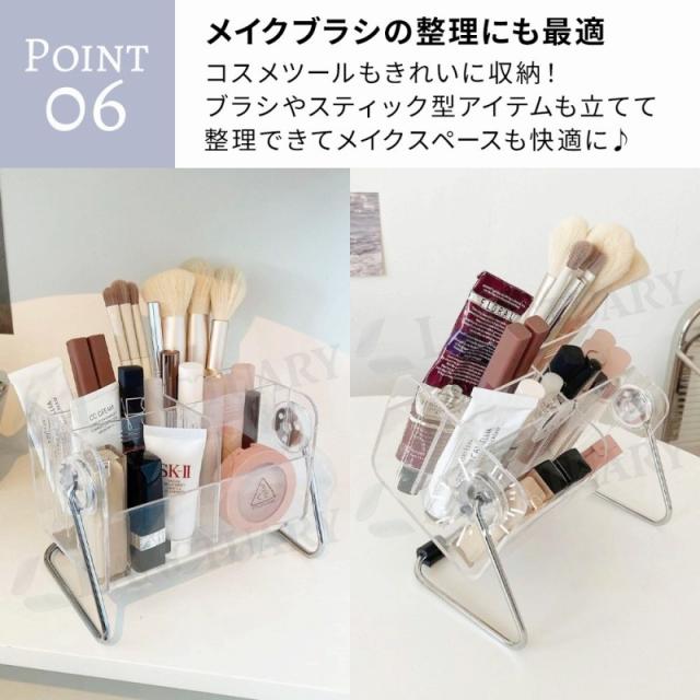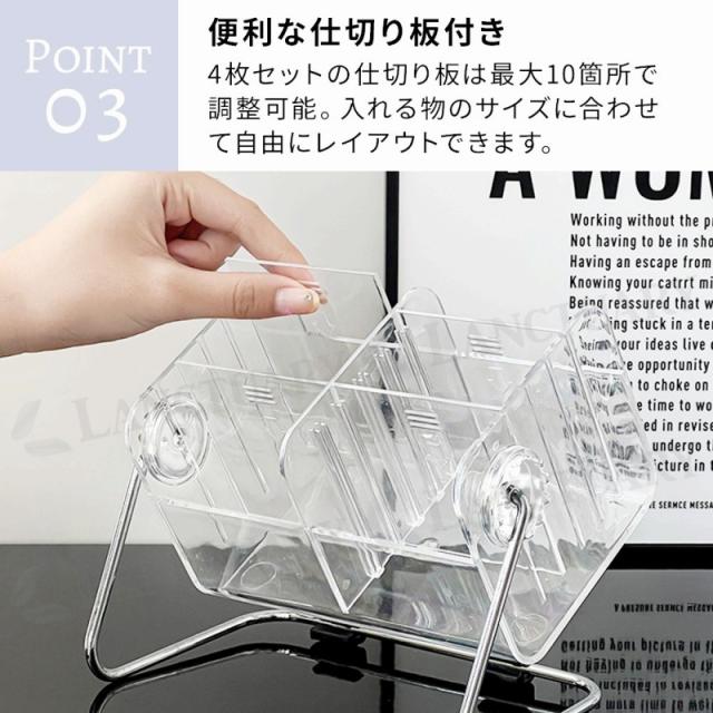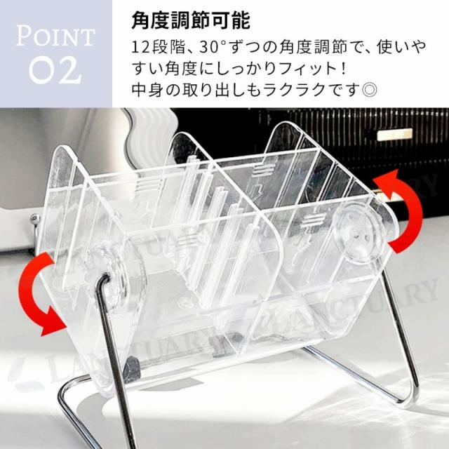 透明素材で中身が見やすく、どんなお部屋にも馴染むデザイン。12段階の角度調整で使いやすく、仕切り板でレイアウト自由。底面には滑り止め付きで安定感◎