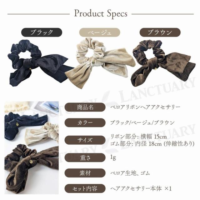 | 主な仕様 | 商品名:ベロアリボンヘアアクセサリー カラー:ブラック/ベージュ/ブラウン サイズ (約):リボン部分: 横幅 15cm ゴム部分: 内径 18cm (伸縮性あり) 重さ (約):1g 素材:ベロア生地、ゴム セット内容:ヘアアクセサリー本体 ×1 |