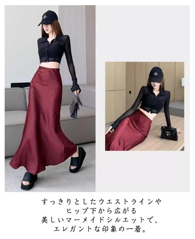 | しなやかドレープのある落ち感と、綺麗なシルエットのスカート。 すっきりとしたウエストラインやヒップ下から広がる美しいマーメイドシルエットで、エレガントな印象の一着。 | |
