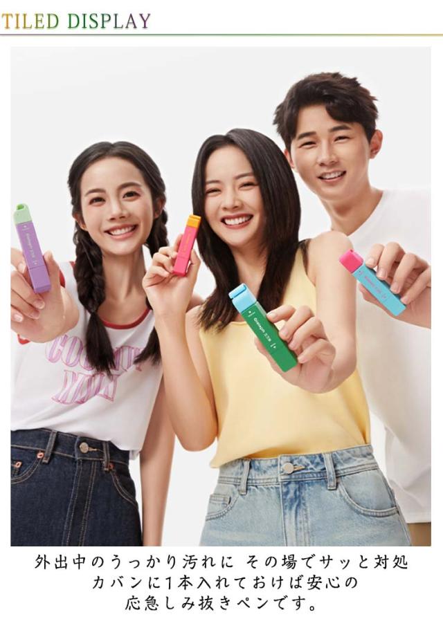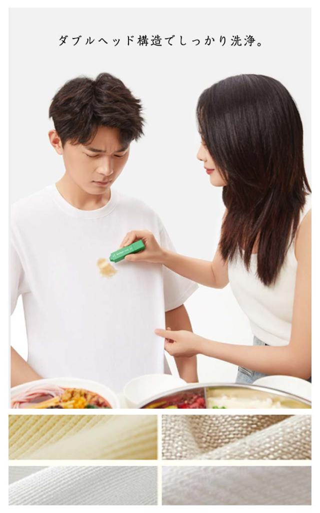 | 外出中のうっかり汚れに その場でサッと対処 カバンに1本入れておけば安心の応急しみ抜きペンです。 ダブルヘッド構造でしっかり洗浄。 A面:液体ローラーでピンポイントに洗浄液を塗布。 B面:ブラシヘッドで繊維の奥までしっかりこすり洗い カフェでの飲みこぼし、食事中の油シミ 子どもの食べこぼしなど、様々な日常のトラブルにすぐ対応できます。 4種の洗浄成分で幅広い汚れに対応。 油汚れ、ソース、コーヒー、ケチャップ、化粧品、ワインなど 頑固な汚れにも効果を発揮します。 持ち歩きに便利なコンパクトサイズ。 軽量でバッグに入れても邪魔にならず、外出先でも手軽に使えます。 | |
