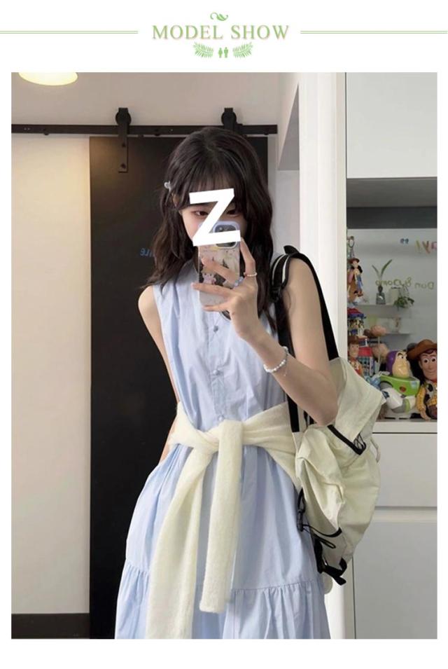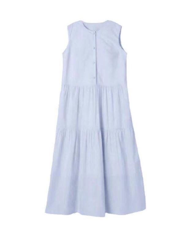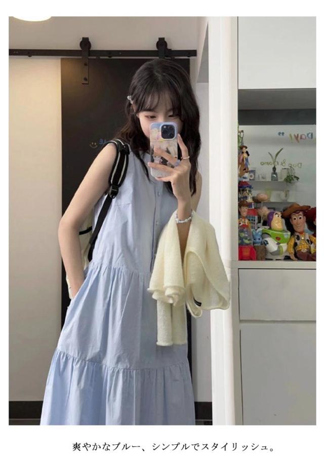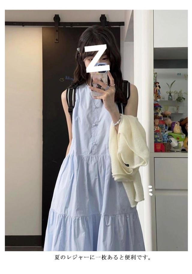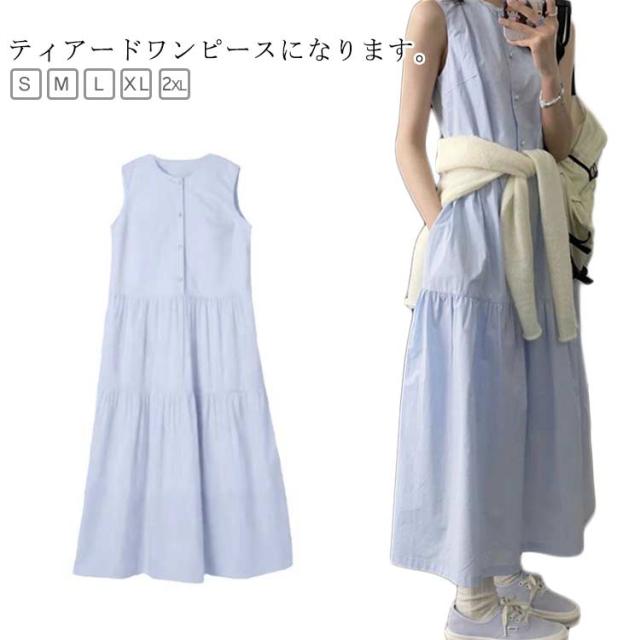 | ティアードワンピースになります。 夏のレジャーに一枚あると便利です。 爽やかなブルー、シンプルでスタイリッシュ。 ノースリーブなのでインナーを着たり、カーディガンを羽織ったり着回しができますよ。 | |