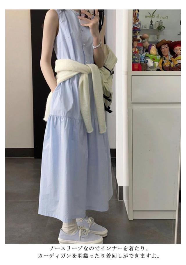 ノーカラー シャツワンピース ノースリーブワンピース レディース ミモレ丈 無地 夏 ロングワンピース シャツワンピース ロング きれいめ フレアワンピース Aライン 体型カバー 着痩せ