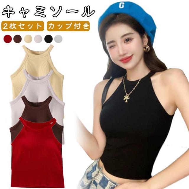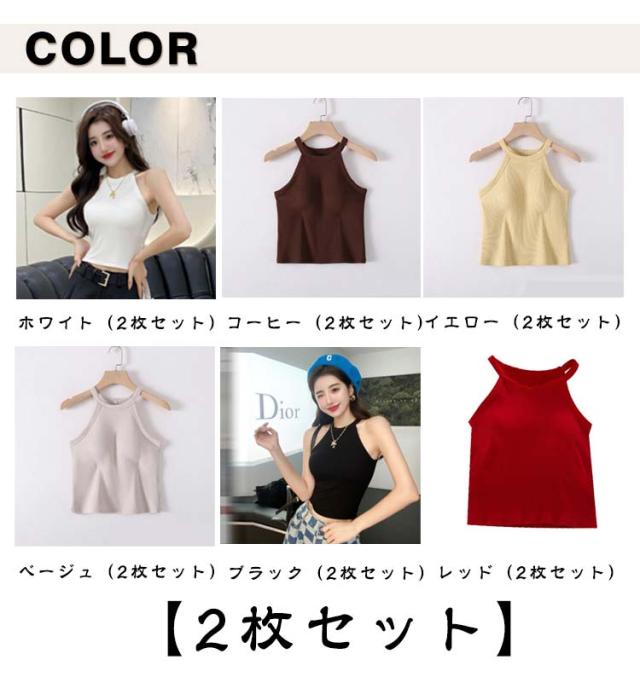 レディース カップ付き トップス タンクトップ リブ レイヤード 2枚セット キャミソール おしゃれ ブラカップ ブラトップ 春夏 リブ生地 ノースリーブ ホルターネック 部屋着 インナー 無地 重ね着 お洒落 シンプル ストレッチ性 リラックスウエア