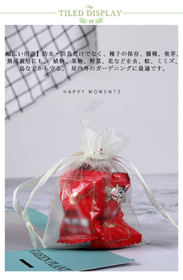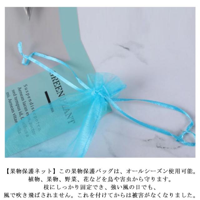 | 【幅広い用途】防虫・防鳥だけでなく、種子の保存、播種、発芽、熟成栽培にも。 植物、果物、野菜、花などを虫、蚊、ミミズ、鳥などから守る。 屋内外のガーデニングに最適です。 【通気性のメッシュ素材】丈夫なオーガンジー素材で作られた果物袋は、耐腐食性と耐久性に優れ、軽量で通気性が良く、頑丈なのが特徴です。この透過型デザインは、光合成を妨げないため、野菜や果物の日光の吸収がよくなり、健康に育つことができます。網目が細かくて非常に良い、繰り返し使える。 【果物保護ネット】この果物保護バッグは、オールシーズン使用可能。植物、果物、野菜、花などを鳥や害虫から守ります。枝にしっかり固定でき、強い風の日でも、風で吹き飛ばされません。これを付けてからは被害がなくなりました。 【巾着設計】フルーツメッシュバッグは巾着タイプなので、しっかり閉じることができます。開閉にも非常に便利です。袋に入れたまま果実を保存できる。ブドウ、リンゴ、イチゴ、イチジク、植物、野菜、花を保護し、植物を健康に保ちます。 【害虫鳥避け】果物保護袋は、ミバエ、鳥、カラスを防ぐことができます。虫よけ、鳥よけにはなる。果樹のカラス、ヒヨドリ対策。このタイプはメッシュのテグスが太くしっかりしており、袋状に被せることができるタイプで、効果バツグンでした。さらに使いやすい。蟻の侵入も全くなかった。使いやすさと使用効果。 | |