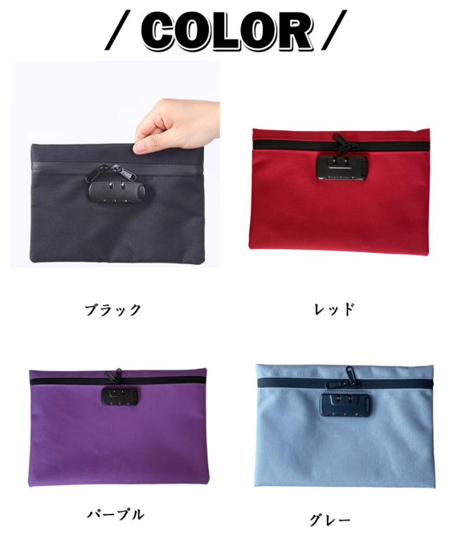 | 【鍵付きポーチ】 貴重品の収納・持ち運びに使用できる鍵付きのポーチです。 お札や通帳がすっぽり収まる程よいサイズ感。 海外旅行や集金時など、貴重品を持ち歩く際に便利です。 3桁のダイアル式ロックが施されており、貴重品を安全に保管できます。初期設定は000で、お好みに応じてコードを手動で変更可能です。 ビジネスシーンからカジュアルな外出、特別なイベントまで幅広いシーンで活躍します。 | |