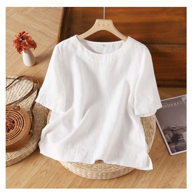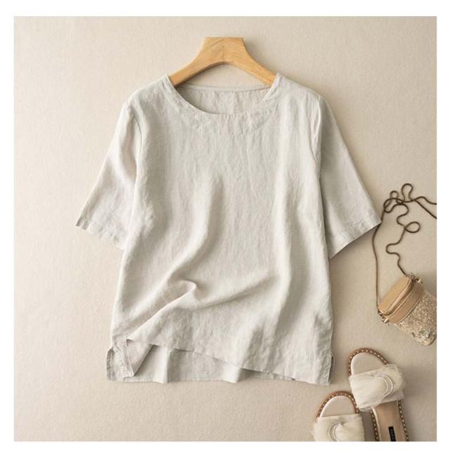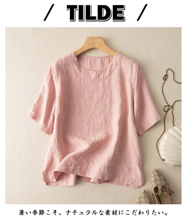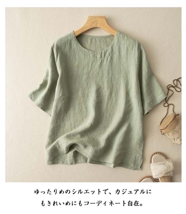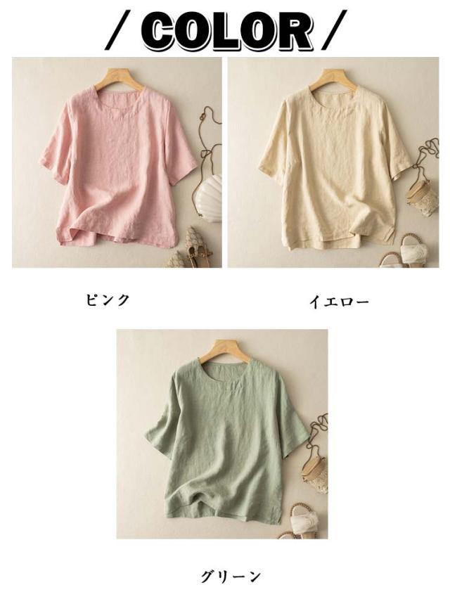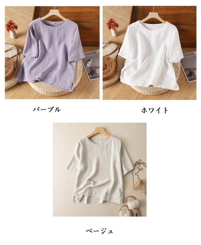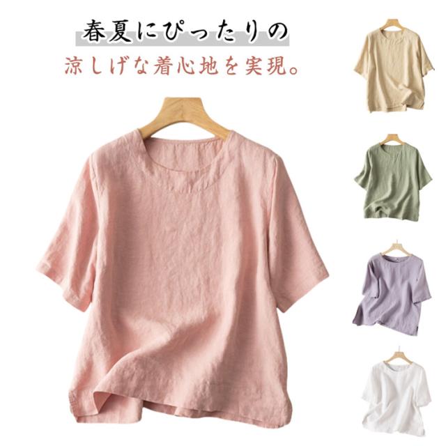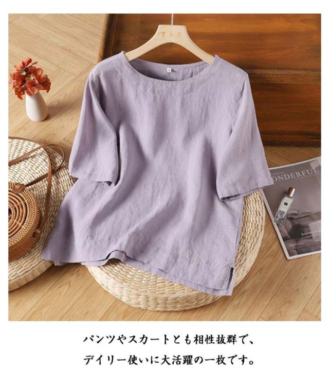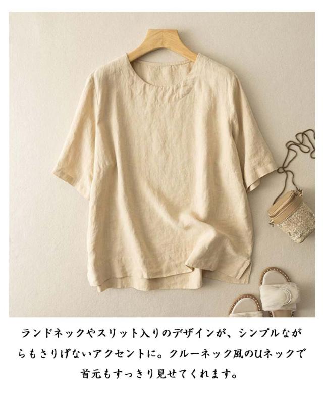 ブラウス 綿麻 半袖 ランドネック Tシャツ レディース トップス 綿麻 女性 スリット 半袖 クルーネック 夏 プルオーバー シャツブラウス ブラウス 春 夏 ファッション uネック カジュアル
