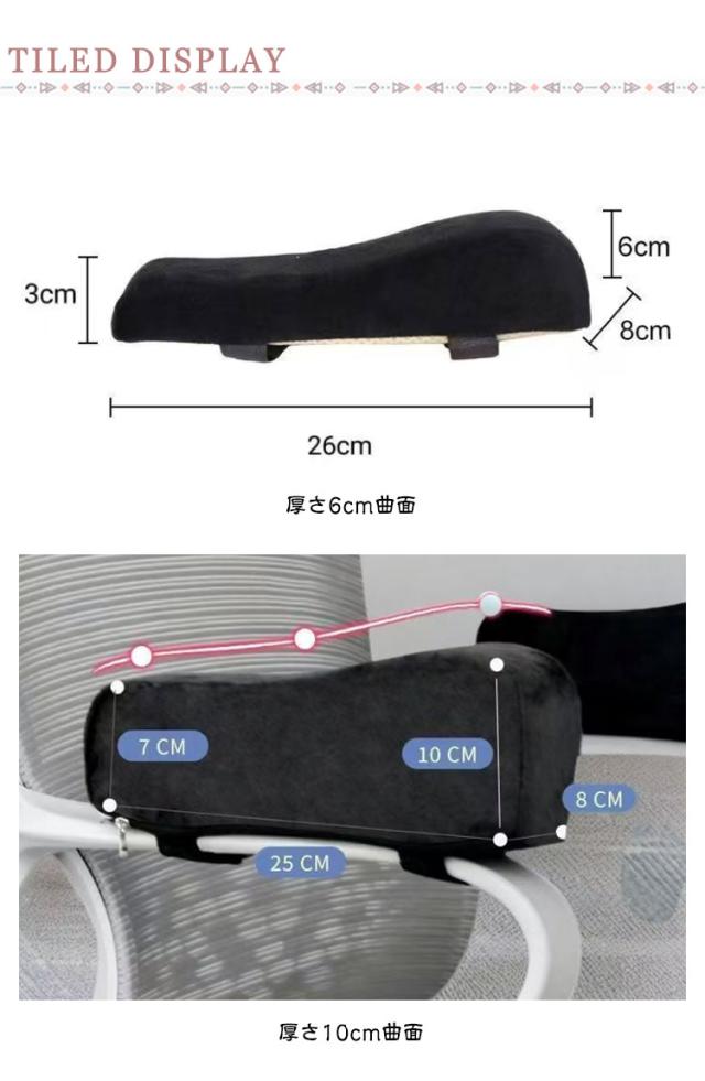 | 快適なデスクワークをサポート ひじ置きクッション デスクワーク中!・座席のひじ置きが硬すぎる ・腕のがひどい ・ひじ掛けが低く腕が空中に浮いた形になってしまう。 ・快適な座り心地がなかなか見つからない …そんな時に活躍します! 【取付簡単】マジックテープで簡単装着。ほとんどのひじ掛けに対応しています。 【腕への完璧なサポート】前から後ろにかけて高さが変わり肘、前腕、手首とそれぞれしっかりとサポートします。 【メモリーフォーム】優れた衝撃吸収で形状を保持。低反発で長期間使ってもへたりにくいのが特徴です。 【洗濯可能】クッションの中身がらくらく取り出せます。外側のカバーは選択可能で衛生的です。※中身は洗わないでください。 | |