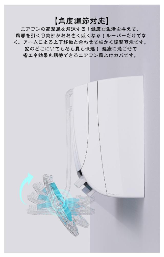 | エアコンの直撃風を防ぐ!3つの風車付きでエアコンの風を循環! エアコンがオンになると、密集した出風孔を通じて、部屋内に均一に流通する,直撃風を部屋に分散させ、室内の温度は「暑い」や「寒い」ことがなく、エアコン病、風邪、頭痛などを予防し、快適な室内環境を作ることができます。 【取付け簡単】取り付けが便利です。ぶら下げ式ので、穴あけ不要で、壁を破らない!取付け方法:1.ボタンをパネルに通して、それぞれ2本の支柱を接続する。2.透明ロッドを鋼管に挿入する。3.鋼管をそれぞれ支柱に挿入する。5.透明フックをエアコンの上部に掛けて、適切な角度を調整する。 【多機種対応&夏も冬も快適に過ごせる】さまざまなニーズに対応でき、調節しやすく、使いやすい。冷暖房兼用で、ほとんどの家庭用・共用エアコン機種に対応。エアコンの風が直接当たることによる冷えや乾燥を防ぐ役割を担っています。風除けで分散された風が部屋全体に広がり、室温が均一に整いやすいのが特徴です。「ここは寒い」「ここは暑い」等の温度ムラを軽減します。 【角度調節対応】エアコンの直撃風を解消する!健康な生活を与えて、風邪を引く可能性がおおきく低くなる!ルーバーだけでなく、アームによる上下移動と合わせて細かく調整可能です。家のどこにいても冬も夏も快適! 健康に過ごせて省エネ効果も期待できるエアコン風よけカバです。 | |