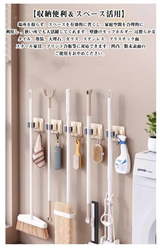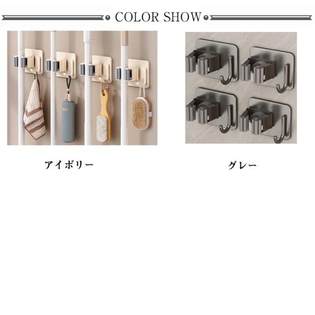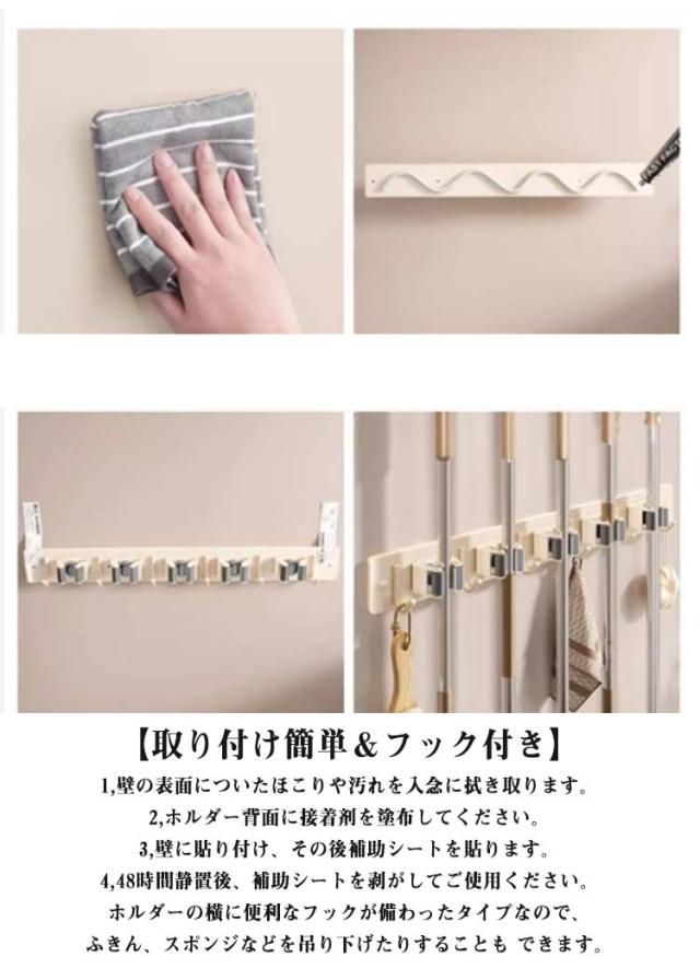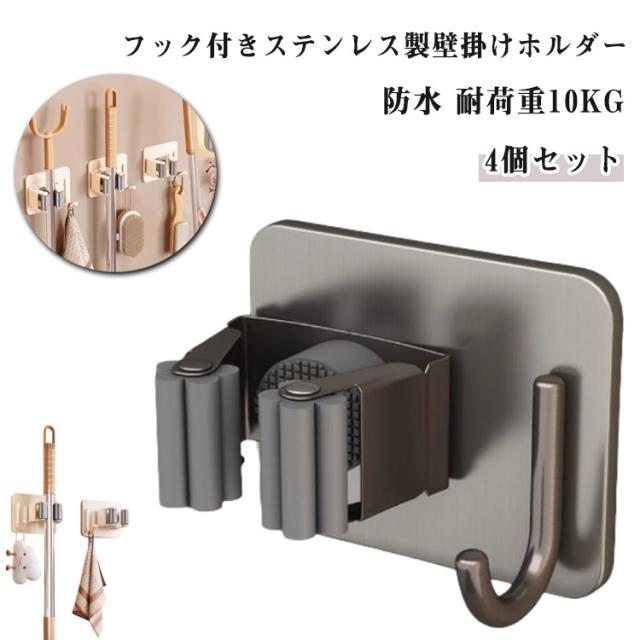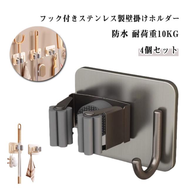 フック モップホルダー モップフック ステンレス 4個セット モップ 壁掛け モップハンガー 防水 耐荷重10KG 壁 モップ収納 穴あけ不要 ほうき フック付 傷つけない ホルダー 浮かせる 収納 粘着式 接着剤付き モップ掛け