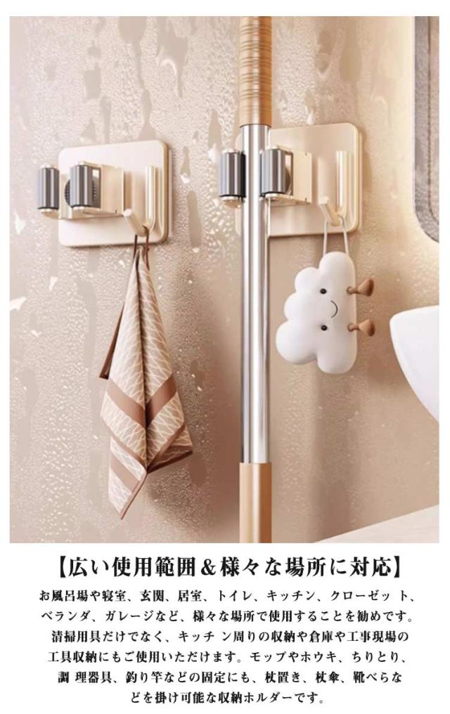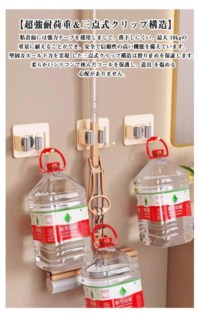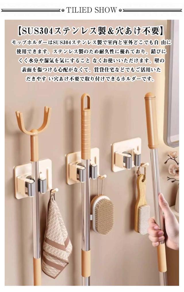 | フック付きステンレス製壁掛けホルダー。【4個セット】【防水】【耐荷重10KG】 【SUS304ステンレス製&穴あけ不要】モップホルダーはSUS304ステンレス製で室内と室外どこでも自 由に使用できます。ステンレス製のため耐久性に優れており、錆びにくく水分や湿気を気にすること なくお使いいただけます。壁の表面を傷つける心配がなくて、賃貸住宅などでもご活用いただきやす い穴あけ不要で取り付けできるホルダーです。 【超強耐荷重&三点式クリップ構造】粘着面には強力テープを採用しまして、落下しにくい、最大 10kgの重量に耐えることができ、安全で信頼性の高い機能を備えています。堅固なホールド力を実現 した三点式クリップ構造は滑り止めを保証します。柔らかいシリコンで挟んだツールを保護し、道具 を傷める心配がありません。 【広い使用範囲&様々な場所に対応】お風呂場や寝室、玄関、居室、トイレ、キッチン、クローゼッ ト、ベランダ、ガレージなど、様々な場所で使用することを勧めです。清掃用具だけでなく、キッチ ン周りの収納や倉庫や工事現場の工具収納にもご使用いただけます。モップやホウキ、ちりとり、調 理器具、釣り竿などの固定にも、杖置き、杖傘、靴べらなどを掛け可能な収納ホルダーです。 【収納便利&スペース活用】場所を取らず、スペースを有効的に省くし、家庭空間を合理的に利用し 、狭い所でも大活躍してくれます。壁掛けモップホルダー は滑らかなタイル、塗装、大理石、ガラス、ステンレス、プラスチック面、スチール家具、プリント合板等に対応できます。凹凸、粉末表面のご使用をおやめください。 【取り付け簡単&フック付き】1,壁の表面についたほこりや汚れを入念に拭き取ります。2,ホルダー背面に接着剤を塗布してください。3,壁に貼り付け、その後補助シートを貼ります。4,48時間静置後、補助シートを剥がしてご使用ください。ホルダーの横に便利なフックが備わったタイプなので、ふきん、スポンジなどを吊り下げたりすることも できます。 | |